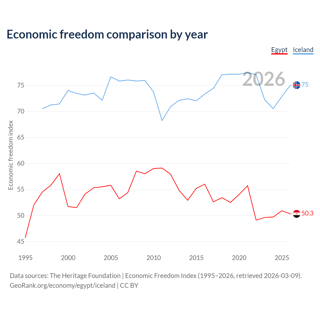 The Economic Freedom Index for Egypt is 50.3, ranking 160/197, compared to 75 for Iceland, ranking 19/197. The chart above displays a comparison of annual changes in economic freedom indexes.