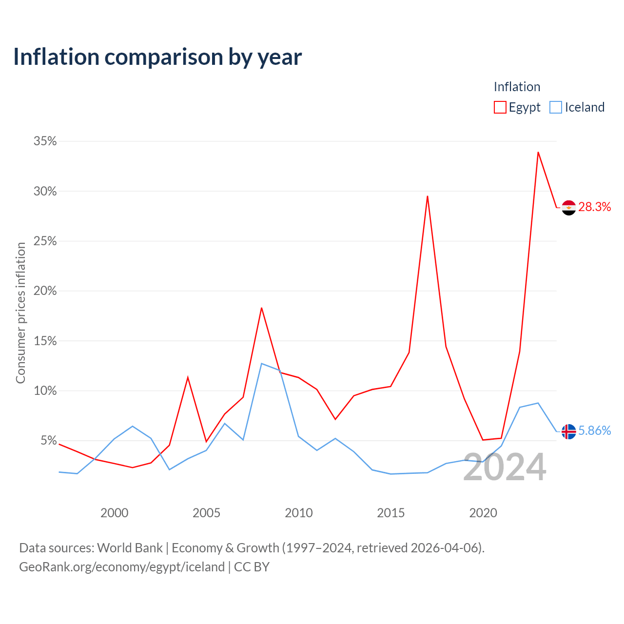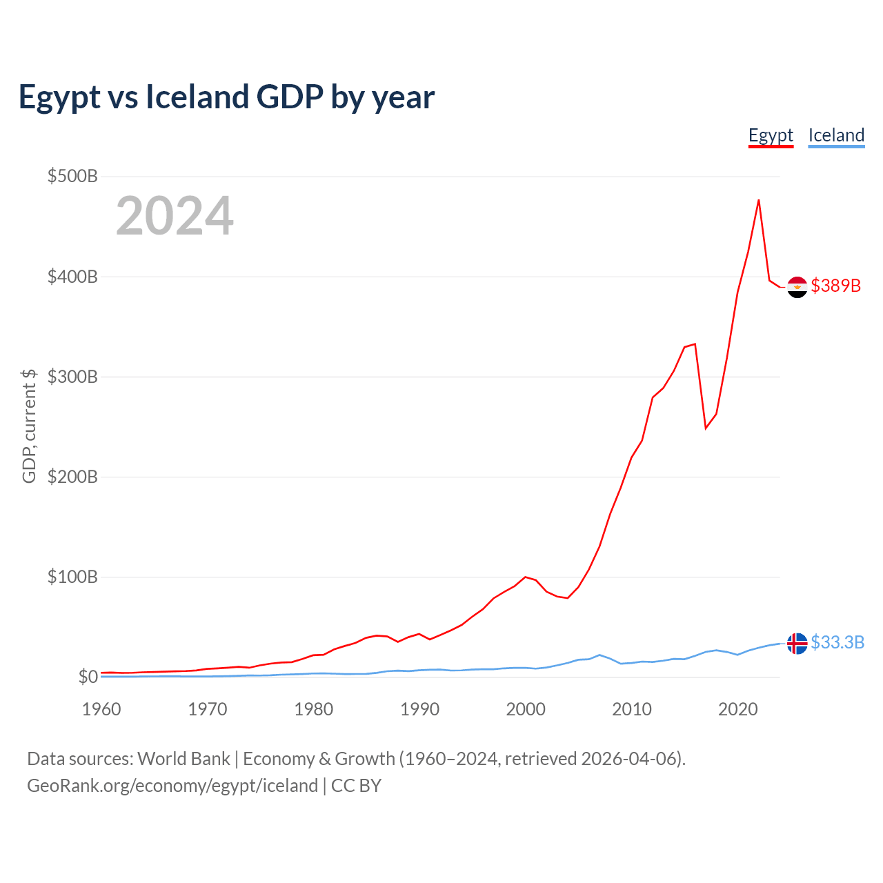 Egypt has a GDP of $389B compared to $33.3B for Iceland, ranking 41/197 and 108/197 by economy size, respectively.
