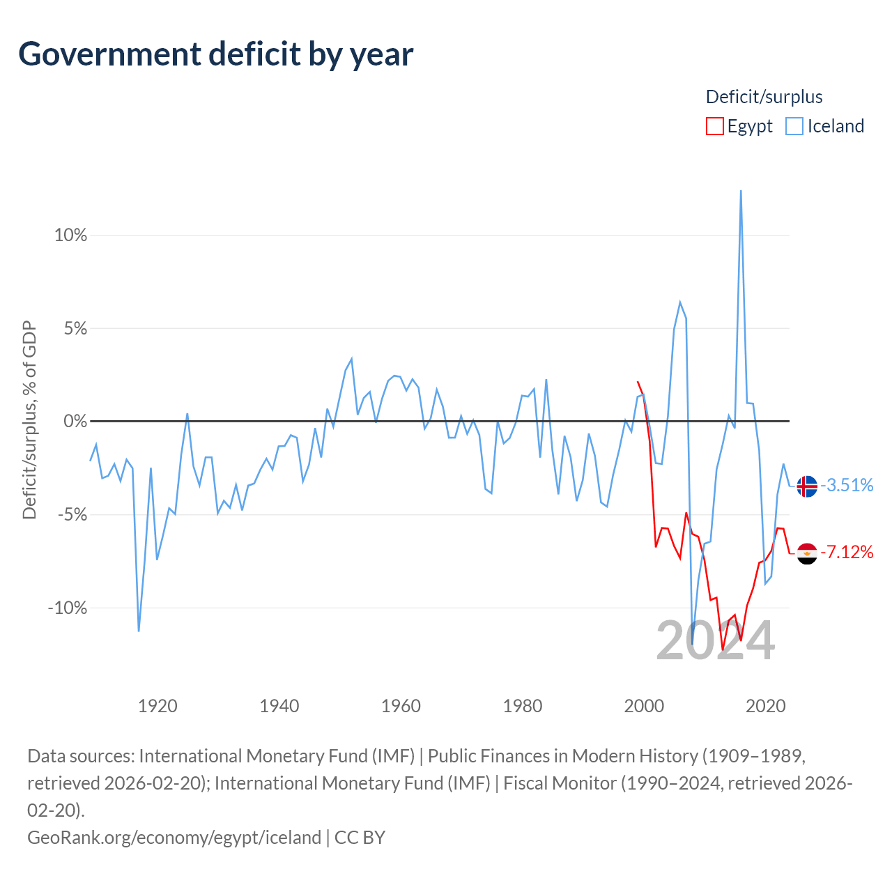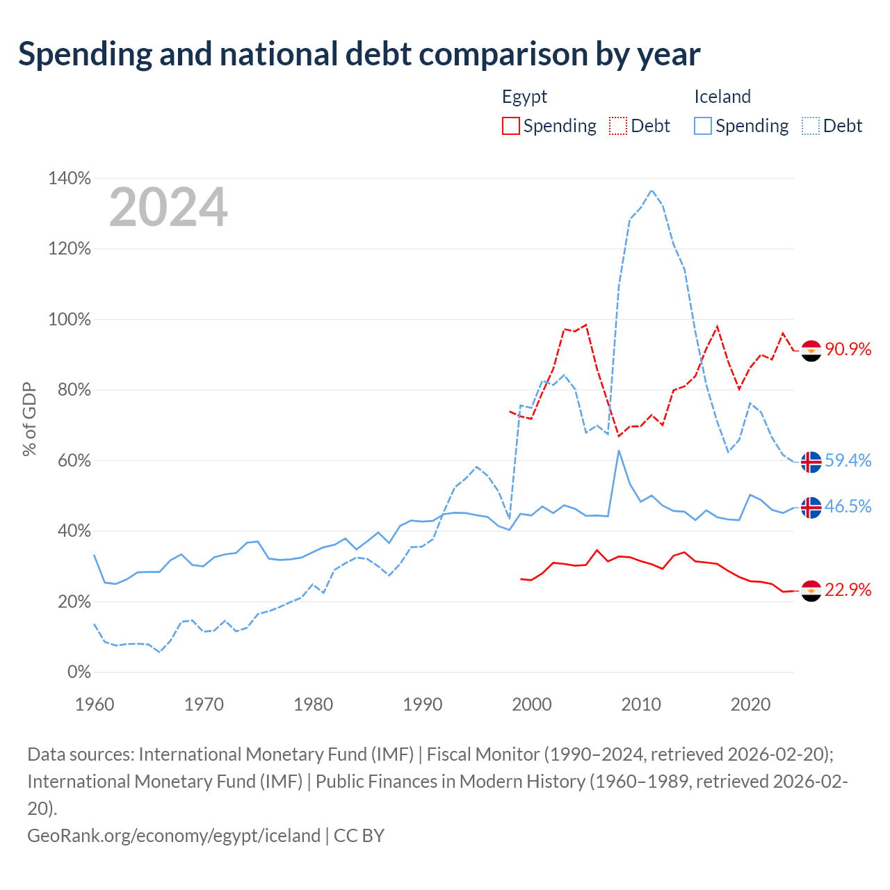 Egypt has $354B in government debt (90.9% of GDP), compared to $19.8B (59.4% of GDP) in Iceland.