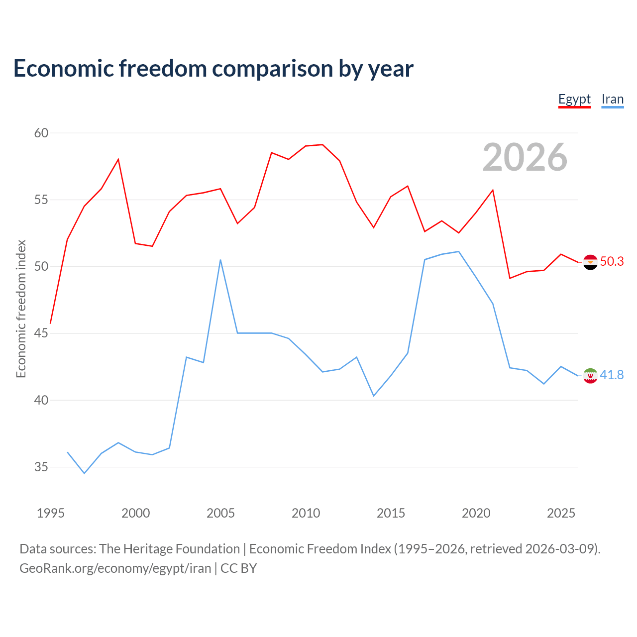 The Economic Freedom Index for Egypt is 50.3, ranking 160/197, compared to 41.8 for Iran, ranking 185/197. The chart above displays a comparison of annual changes in economic freedom indexes.