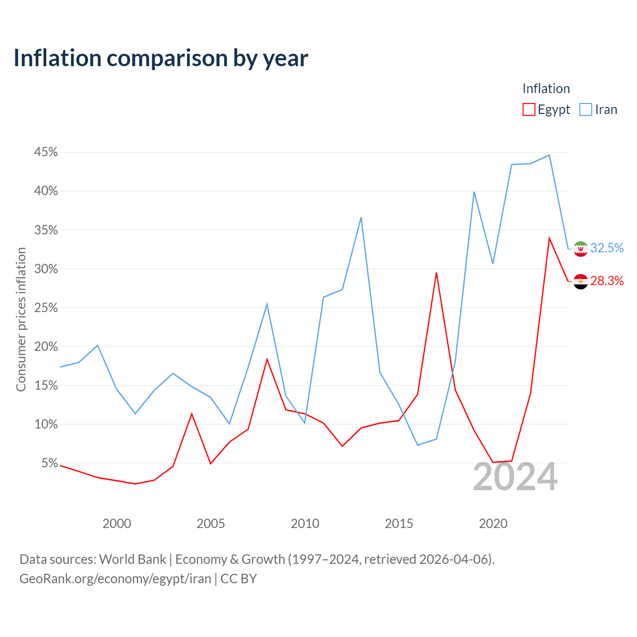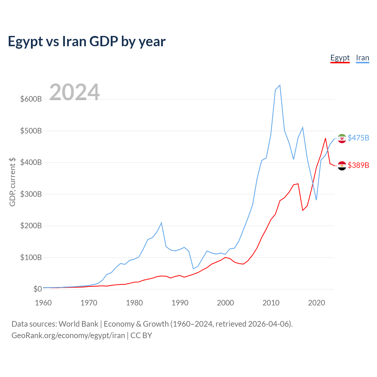 Egypt has a GDP of $389B compared to $475B for Iran, ranking 41/197 and 34/197 by economy size, respectively.