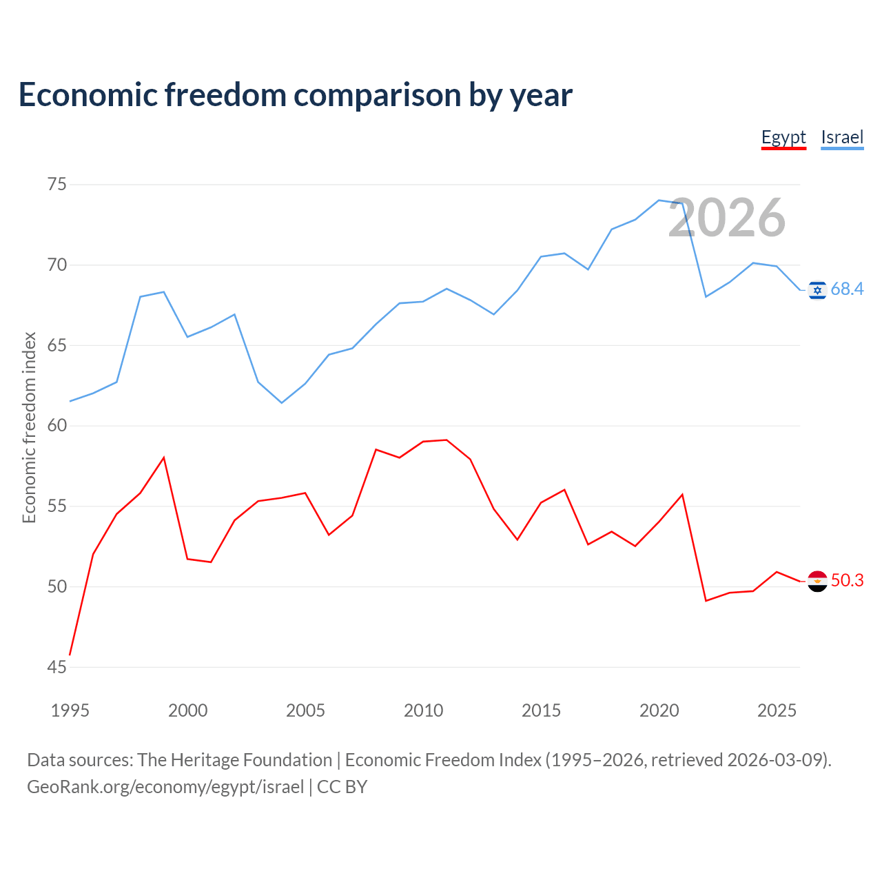 The Economic Freedom Index for Egypt is 50.3, ranking 160/197, compared to 68.4 for Israel, ranking 47/197. The chart above displays a comparison of annual changes in economic freedom indexes.