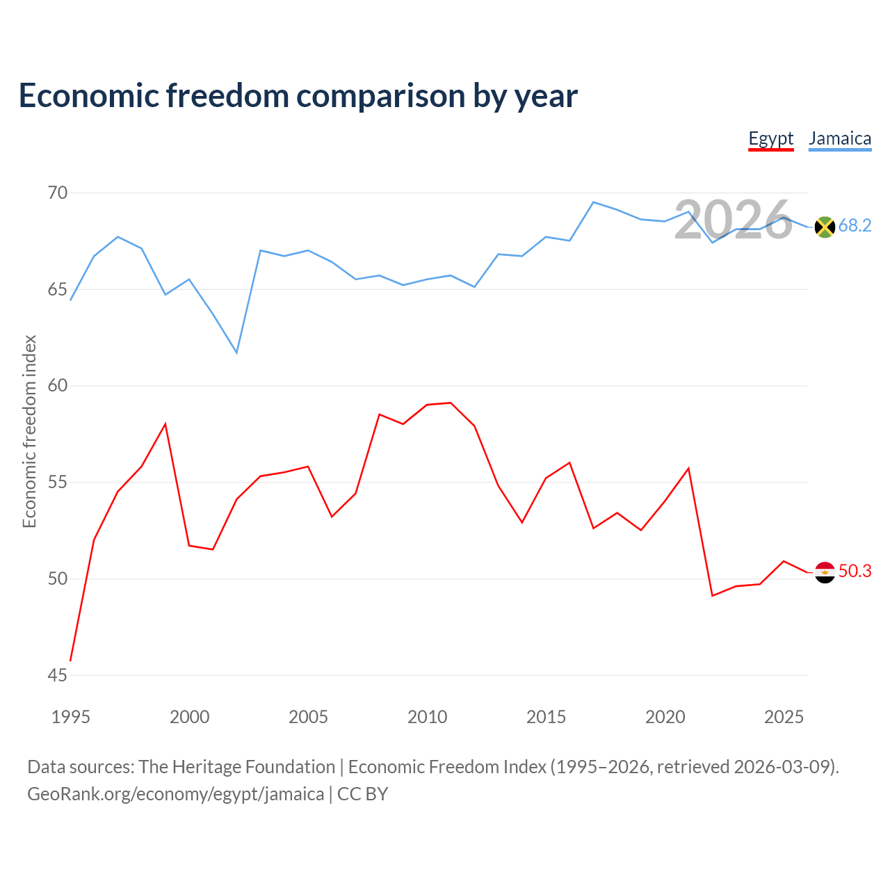 The Economic Freedom Index for Egypt is 50.3, ranking 160/197, compared to 68.2 for Jamaica, ranking 48/197. The chart above displays a comparison of annual changes in economic freedom indexes.