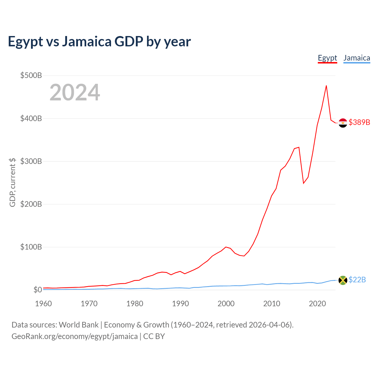 Egypt has a GDP of $389B compared to $22B for Jamaica, ranking 41/197 and 124/197 by economy size, respectively.