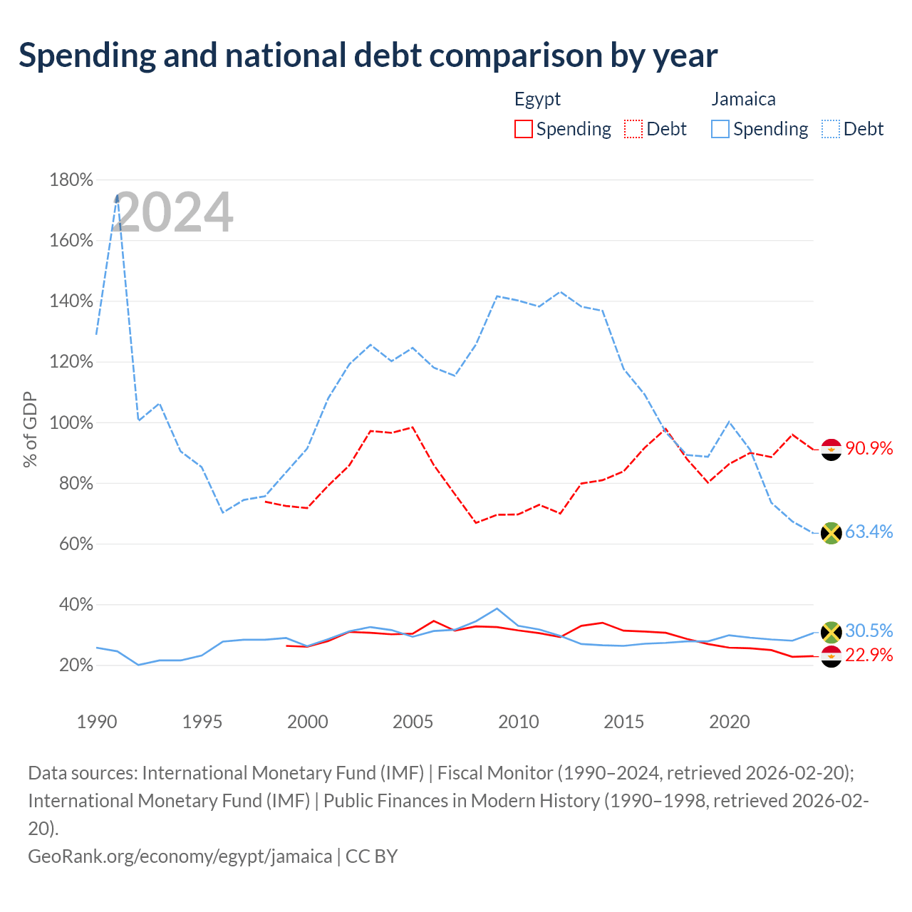 Egypt has $354B in government debt (90.9% of GDP), compared to $14B (63.4% of GDP) in Jamaica.