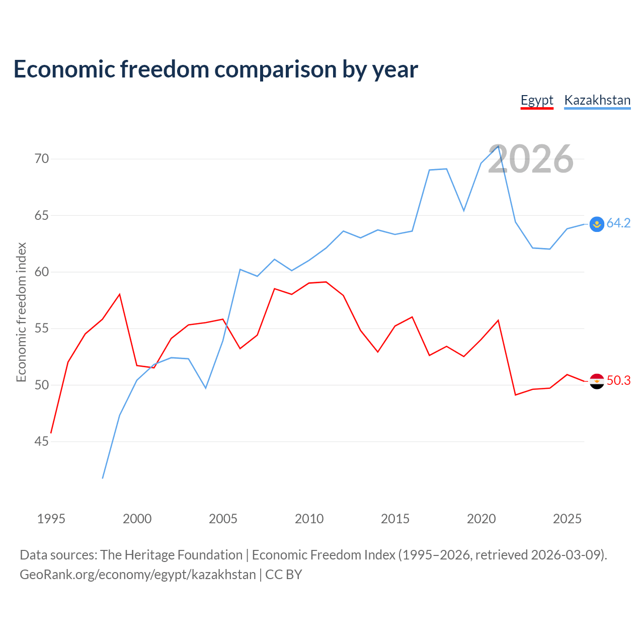 The Economic Freedom Index for Egypt is 50.3, ranking 160/197, compared to 64.2 for Kazakhstan, ranking 75/197. The chart above displays a comparison of annual changes in economic freedom indexes.