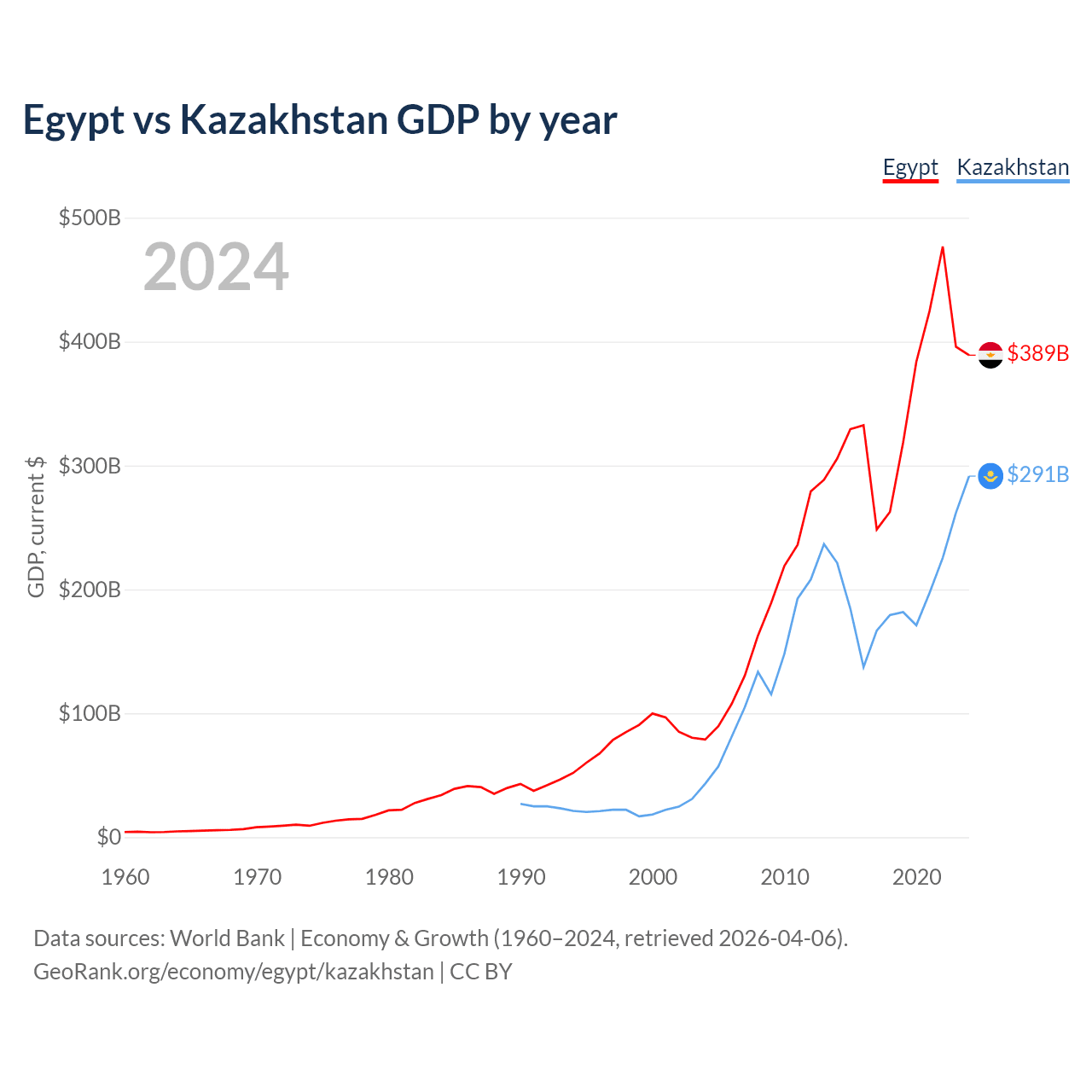 Egypt has a GDP of $389B compared to $291B for Kazakhstan, ranking 41/197 and 48/197 by economy size, respectively.