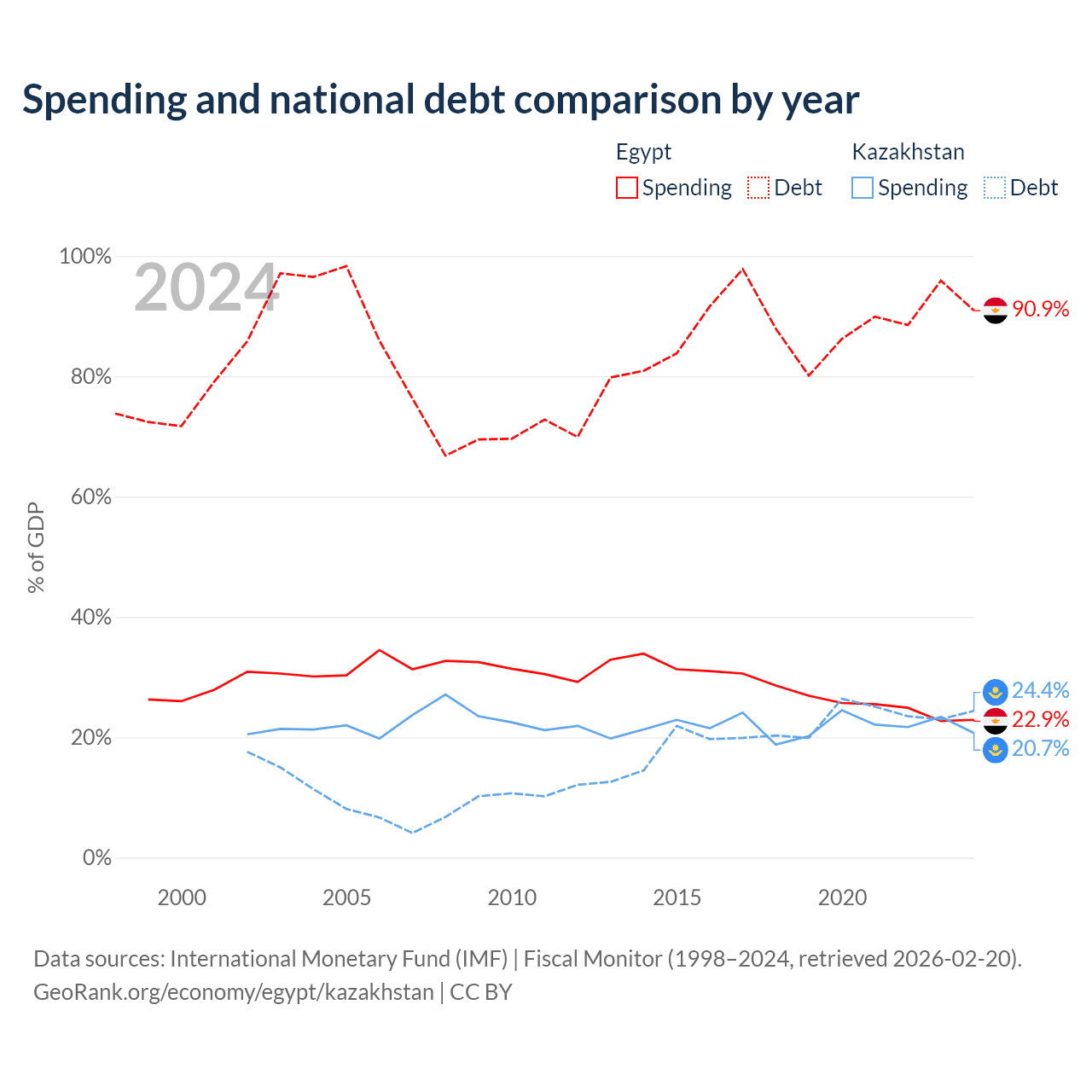 Egypt has $354B in government debt (90.9% of GDP), compared to $71.1B (24.4% of GDP) in Kazakhstan.