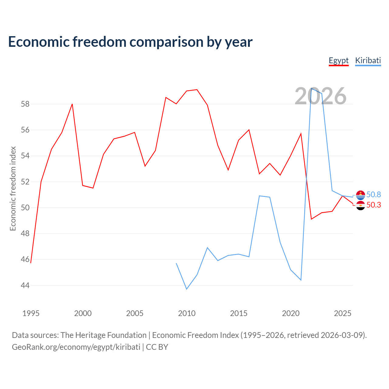The Economic Freedom Index for Egypt is 50.3, ranking 160/197, compared to 50.8 for Kiribati, ranking 158/197. The chart above displays a comparison of annual changes in economic freedom indexes.