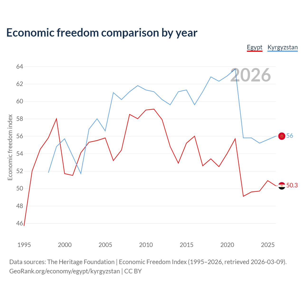 The Economic Freedom Index for Egypt is 50.3, ranking 160/197, compared to 56 for Kyrgyzstan, ranking 126/197. The chart above displays a comparison of annual changes in economic freedom indexes.