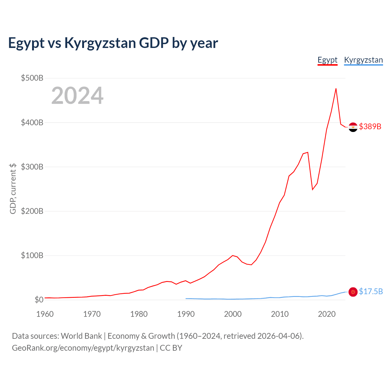 Egypt has a GDP of $389B compared to $17.5B for Kyrgyzstan, ranking 41/197 and 135/197 by economy size, respectively.