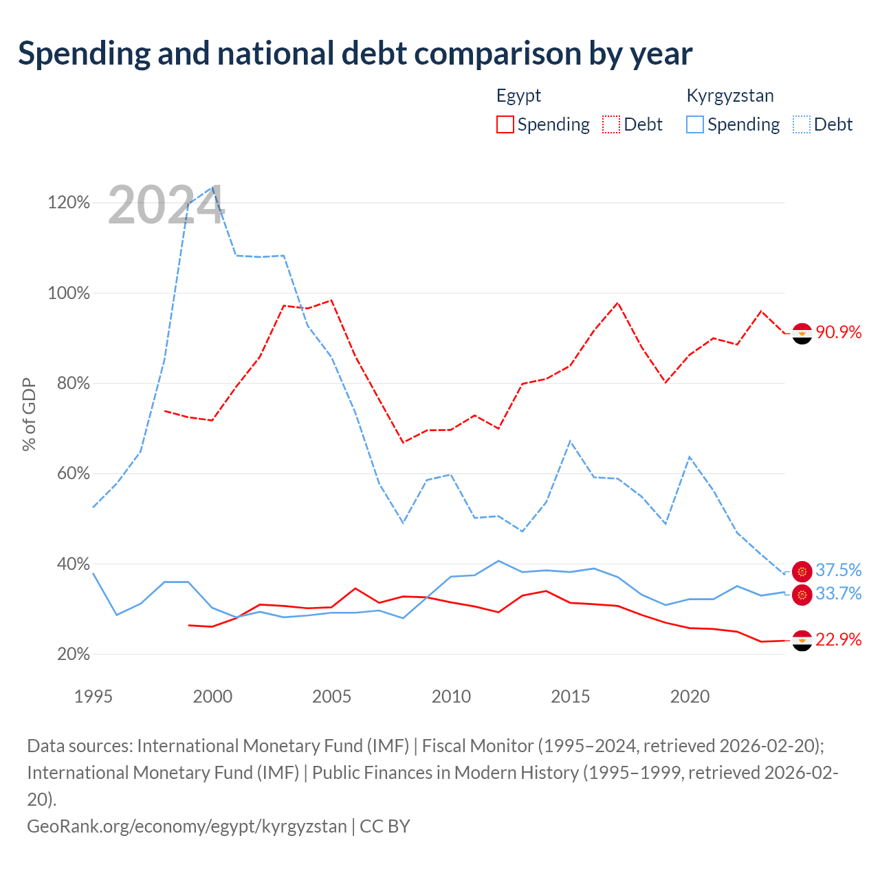 Egypt has $354B in government debt (90.9% of GDP), compared to $6.56B (37.5% of GDP) in Kyrgyzstan.