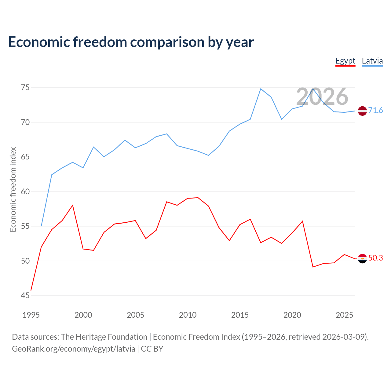 The Economic Freedom Index for Egypt is 50.3, ranking 160/197, compared to 71.6 for Latvia, ranking 31/197. The chart above displays a comparison of annual changes in economic freedom indexes.