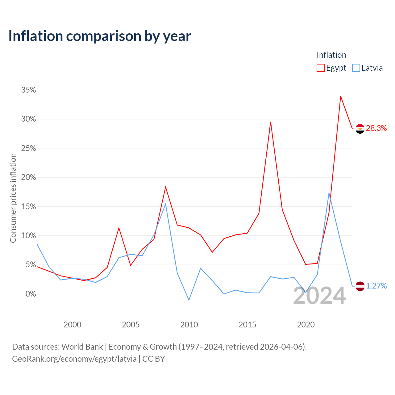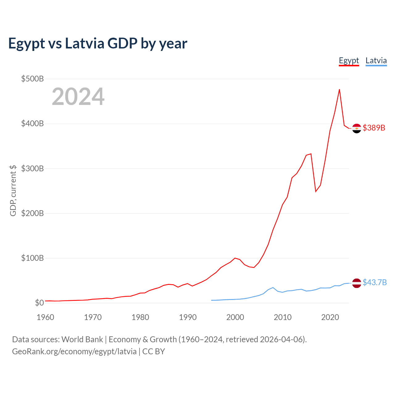Egypt has a GDP of $389B compared to $43.7B for Latvia, ranking 41/197 and 99/197 by economy size, respectively.