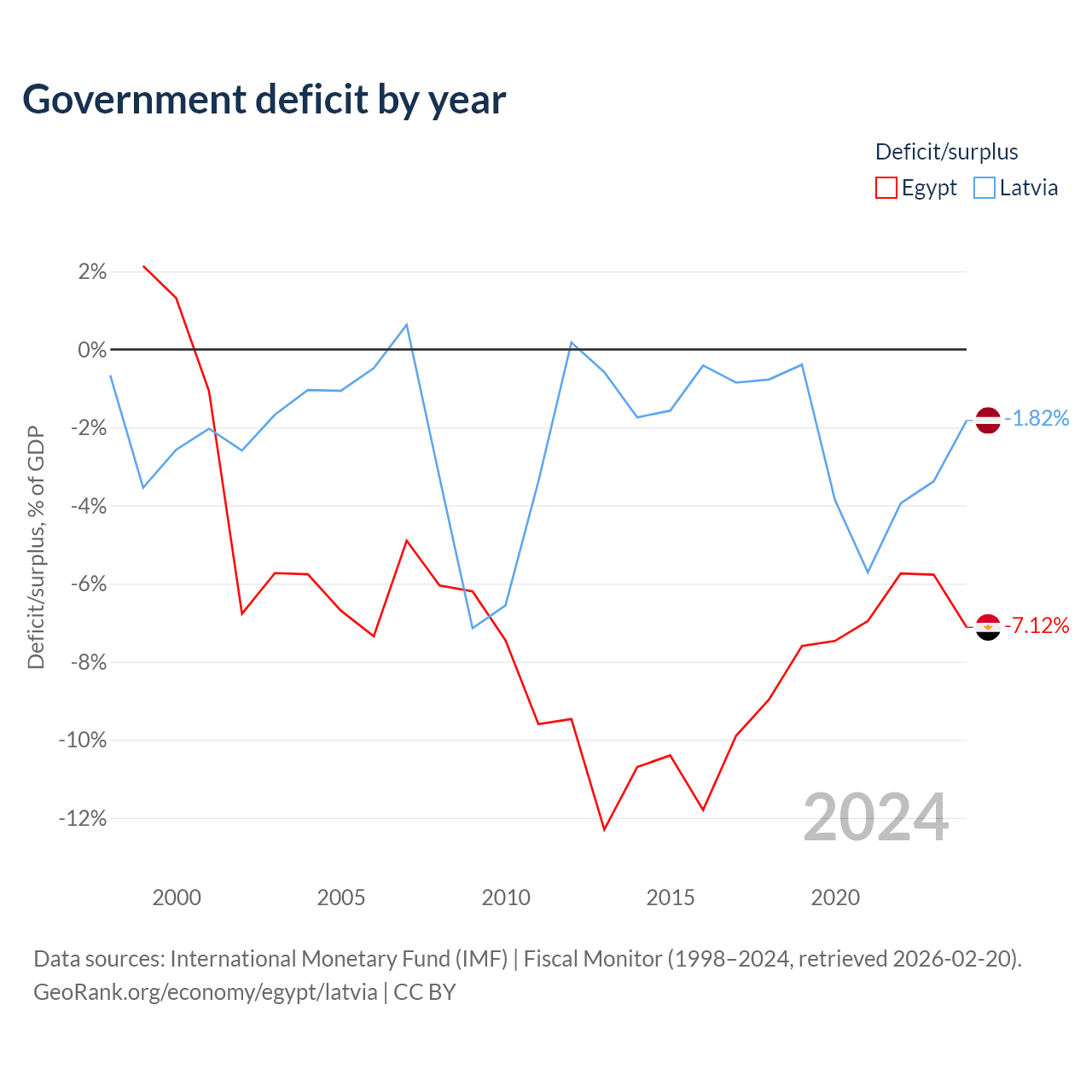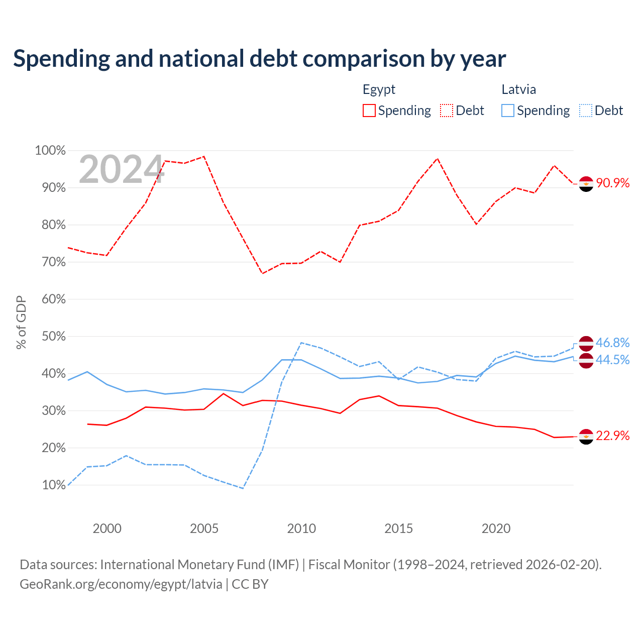 Egypt has $354B in government debt (90.9% of GDP), compared to $20.4B (46.8% of GDP) in Latvia.