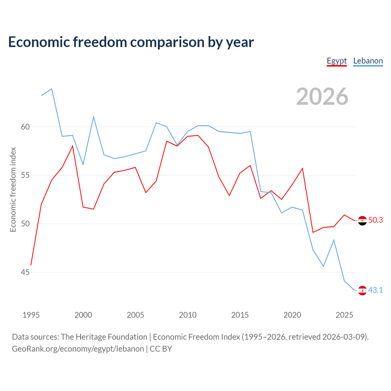 The Economic Freedom Index for Egypt is 50.3, ranking 160/197, compared to 43.1 for Lebanon, ranking 183/197. The chart above displays a comparison of annual changes in economic freedom indexes.