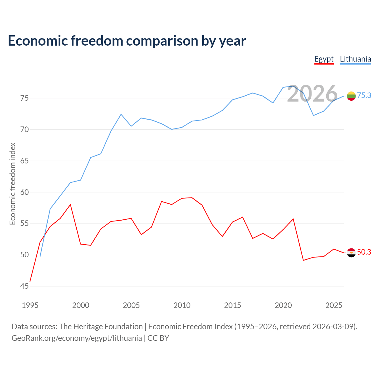 The Economic Freedom Index for Egypt is 50.3, ranking 160/197, compared to 75.3 for Lithuania, ranking 18/197. The chart above displays a comparison of annual changes in economic freedom indexes.