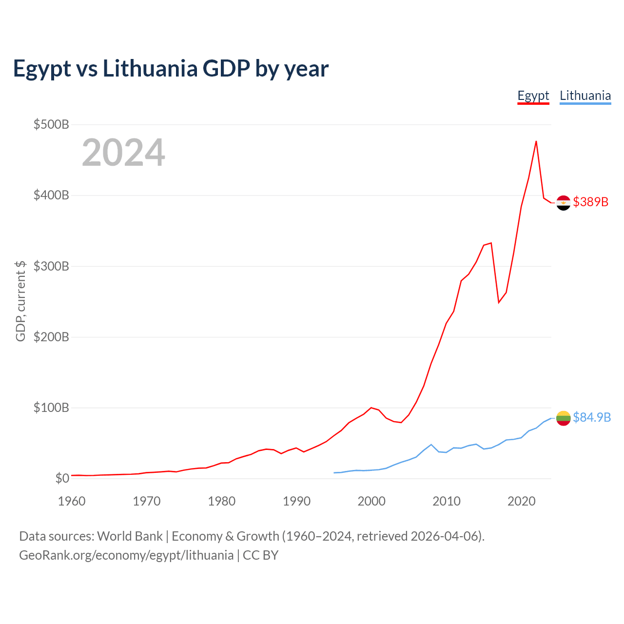 Egypt has a GDP of $389B compared to $84.9B for Lithuania, ranking 41/197 and 79/197 by economy size, respectively.
