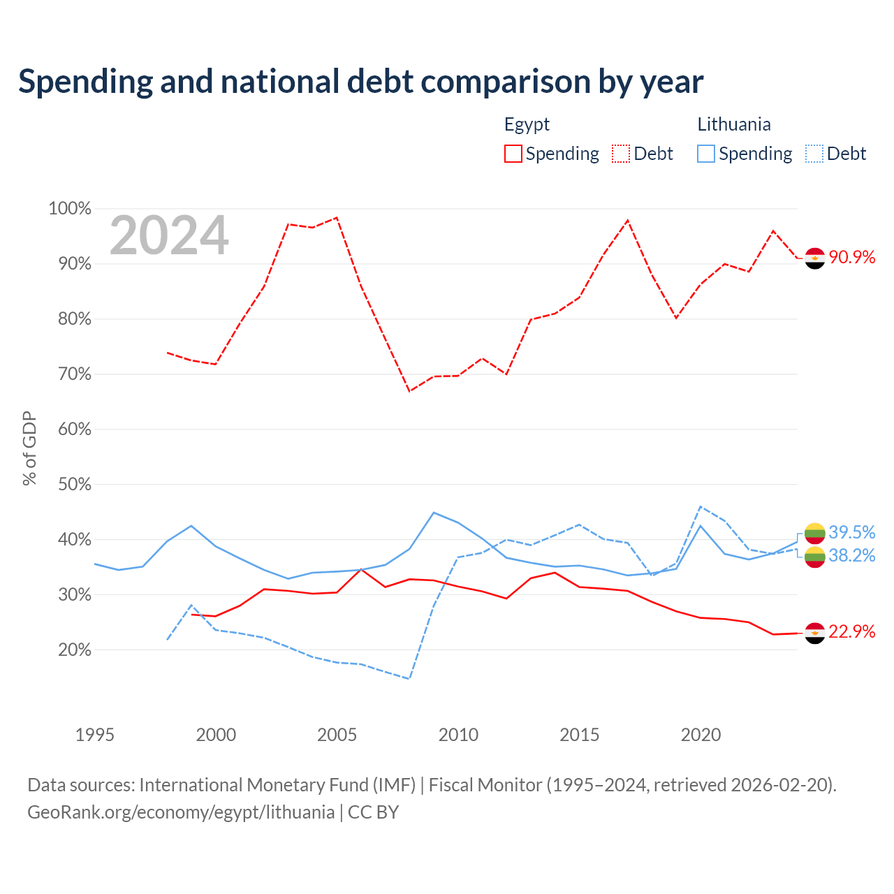 Egypt has $354B in government debt (90.9% of GDP), compared to $32.4B (38.2% of GDP) in Lithuania.