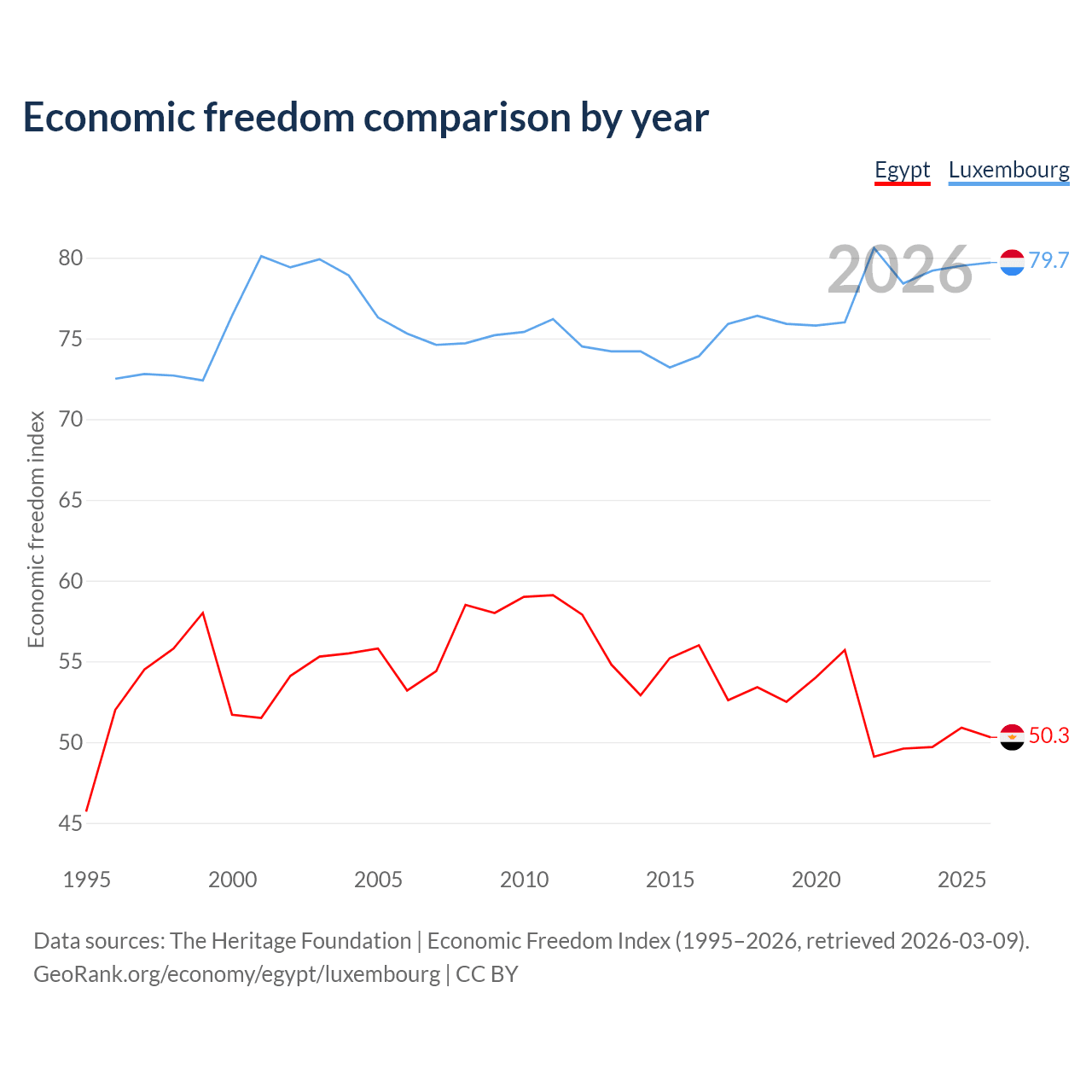 The Economic Freedom Index for Egypt is 50.3, ranking 160/197, compared to 79.7 for Luxembourg, ranking 7/197. The chart above displays a comparison of annual changes in economic freedom indexes.
