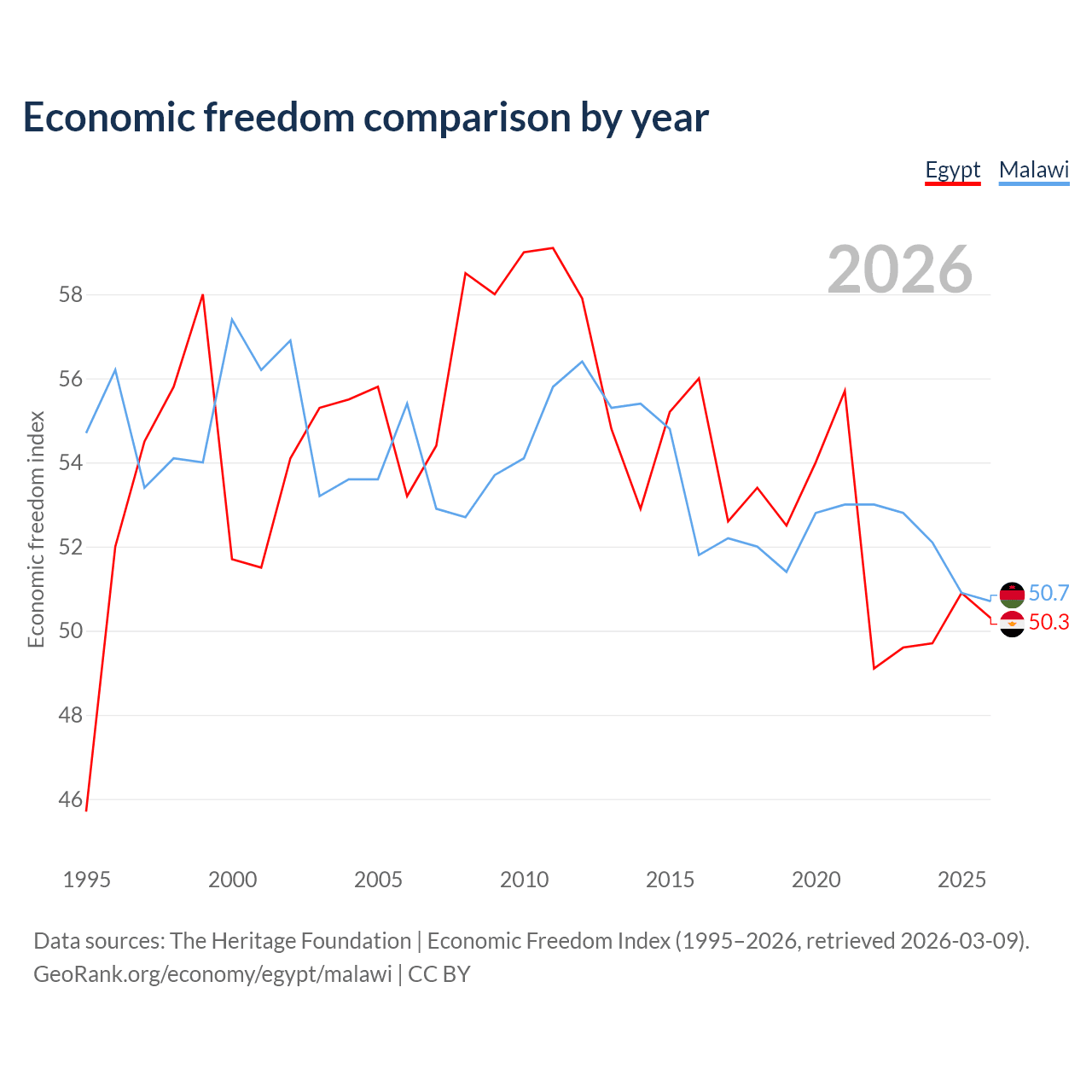 The Economic Freedom Index for Egypt is 50.3, ranking 160/197, compared to 50.7 for Malawi, ranking 159/197. The chart above displays a comparison of annual changes in economic freedom indexes.