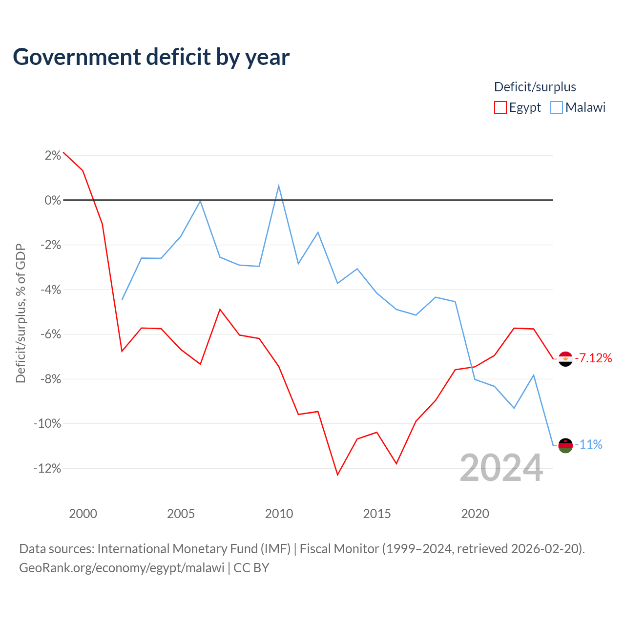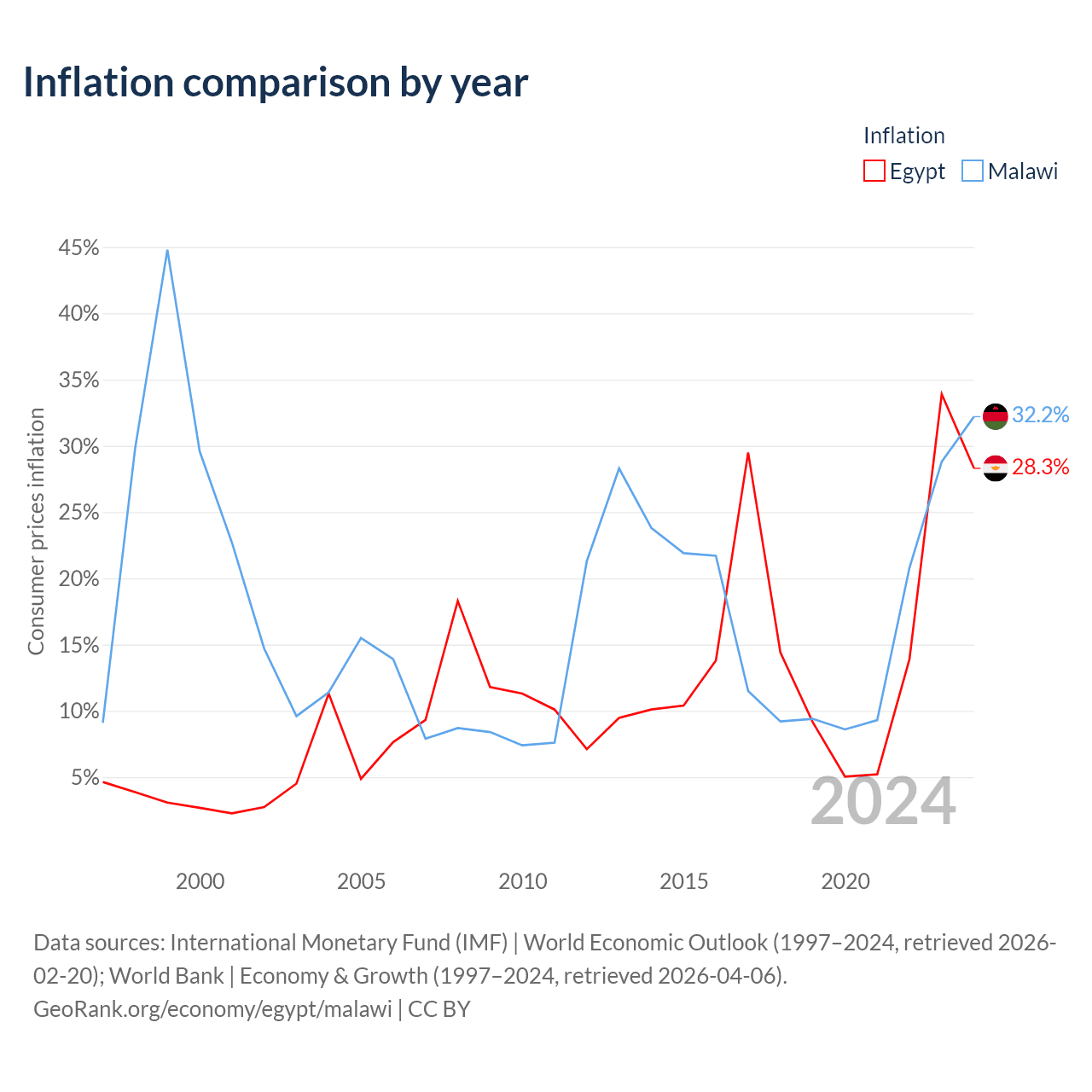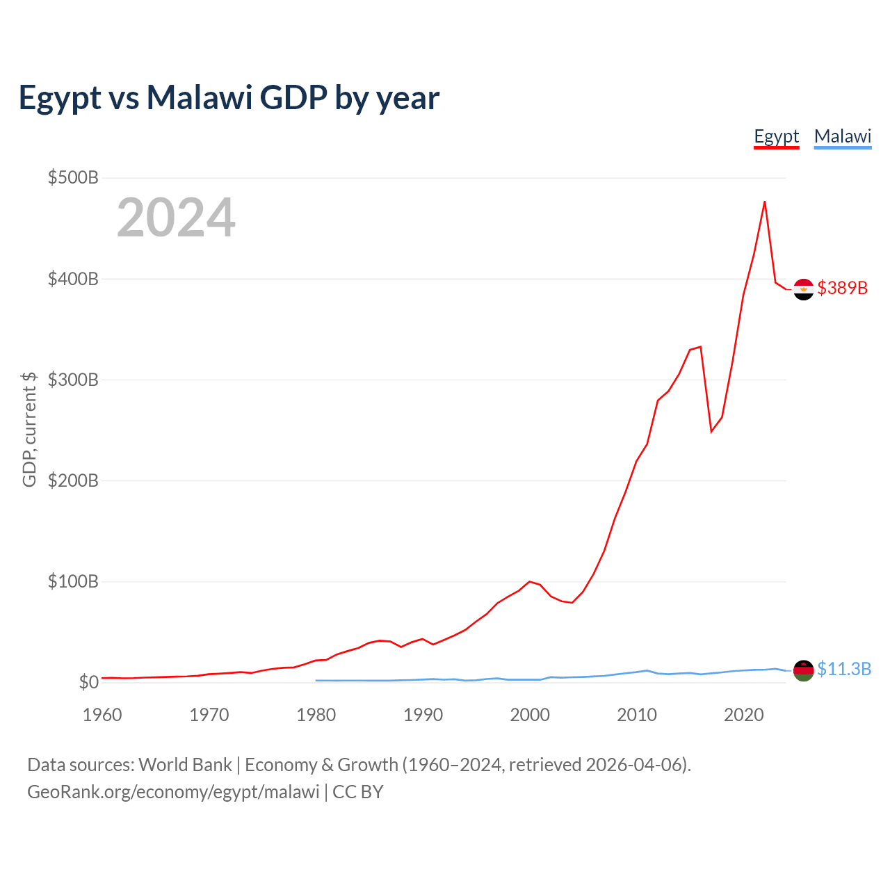 Egypt has a GDP of $389B compared to $11.3B for Malawi, ranking 41/197 and 151/197 by economy size, respectively.