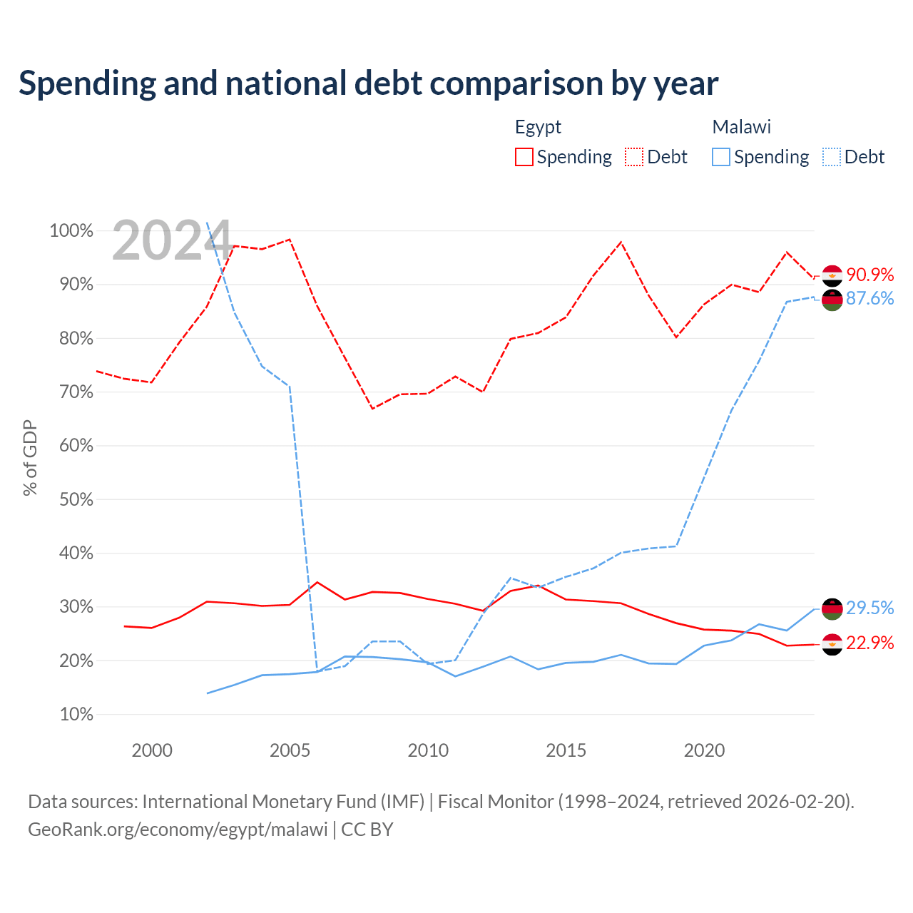 Egypt has $354B in government debt (90.9% of GDP), compared to $9.91B (87.6% of GDP) in Malawi.