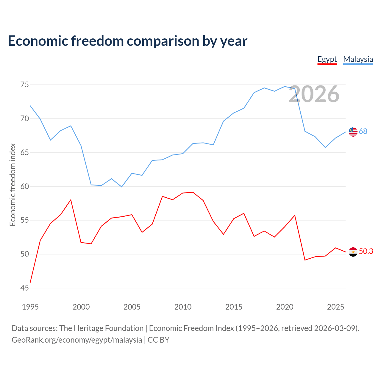 The Economic Freedom Index for Egypt is 50.3, ranking 160/197, compared to 68 for Malaysia, ranking 51/197. The chart above displays a comparison of annual changes in economic freedom indexes.