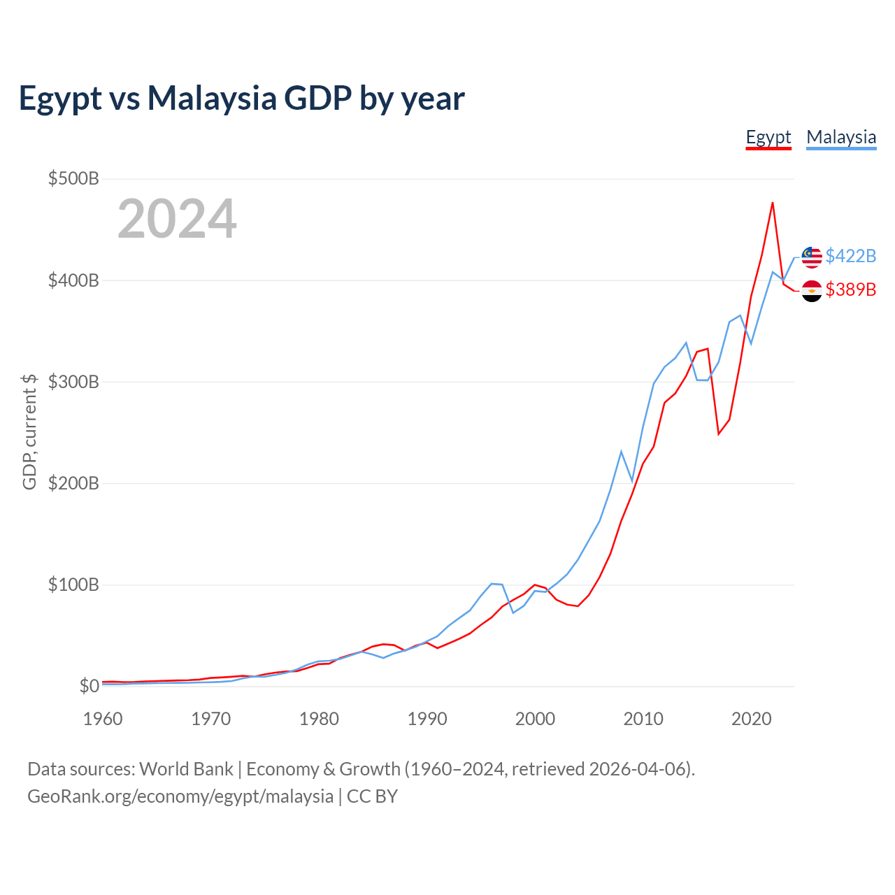 Egypt has a GDP of $389B compared to $422B for Malaysia, ranking 41/197 and 38/197 by economy size, respectively.