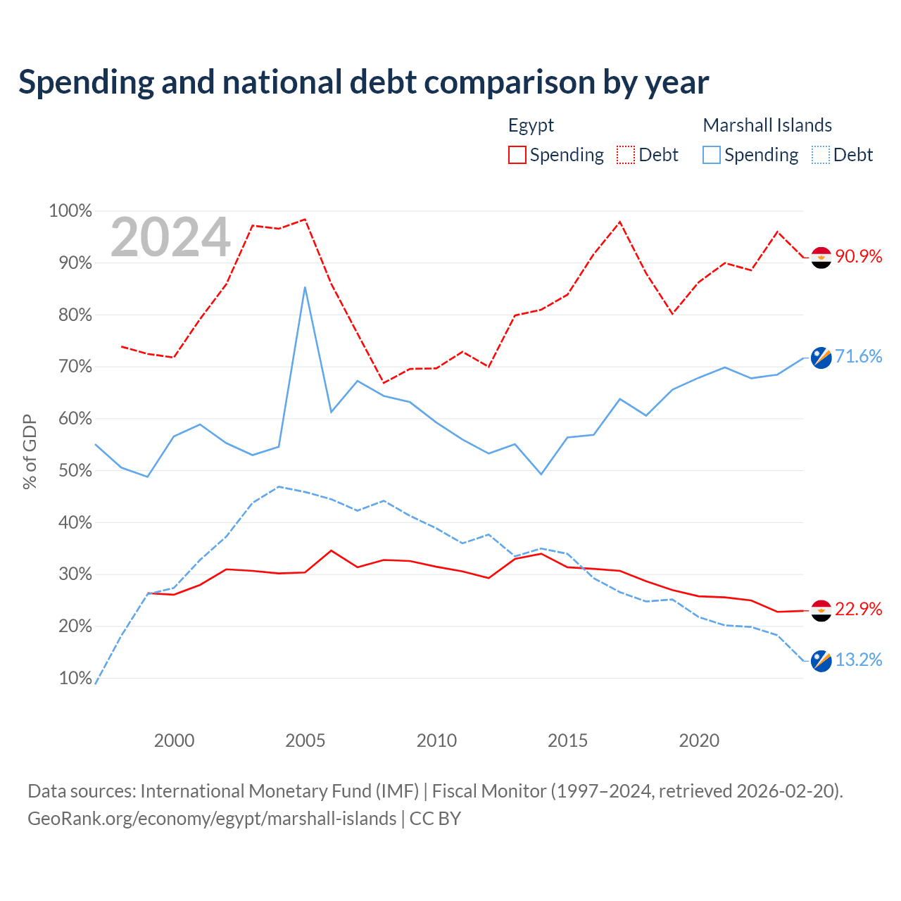 Egypt has $354B in government debt (90.9% of GDP), compared to $38.4M (13.2% of GDP) in the Marshall Islands.