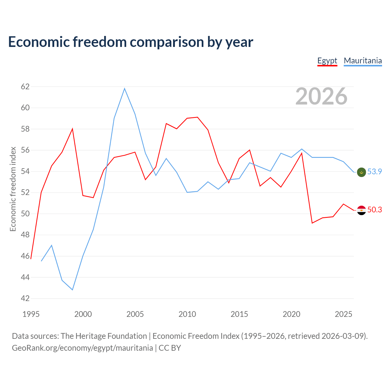 The Economic Freedom Index for Egypt is 50.3, ranking 160/197, compared to 53.9 for Mauritania, ranking 136/197. The chart above displays a comparison of annual changes in economic freedom indexes.