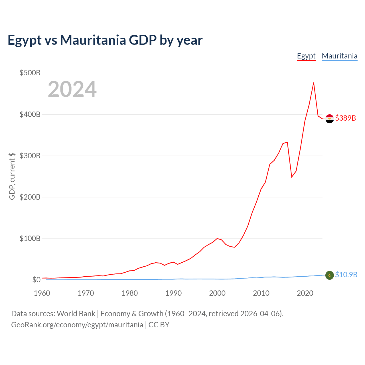 Egypt has a GDP of $389B compared to $10.9B for Mauritania, ranking 41/197 and 153/197 by economy size, respectively.