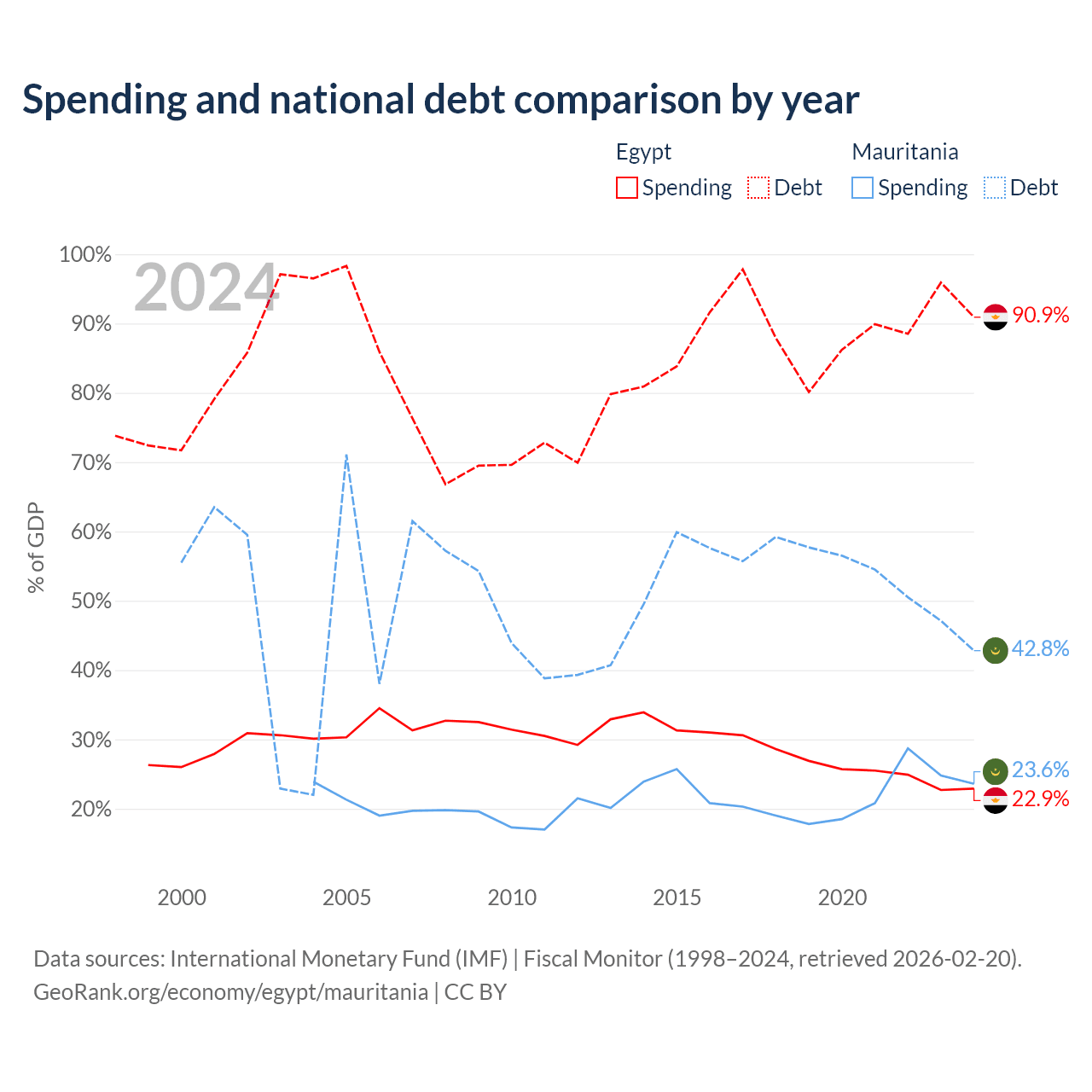 Egypt has $354B in government debt (90.9% of GDP), compared to $4.67B (42.8% of GDP) in Mauritania.