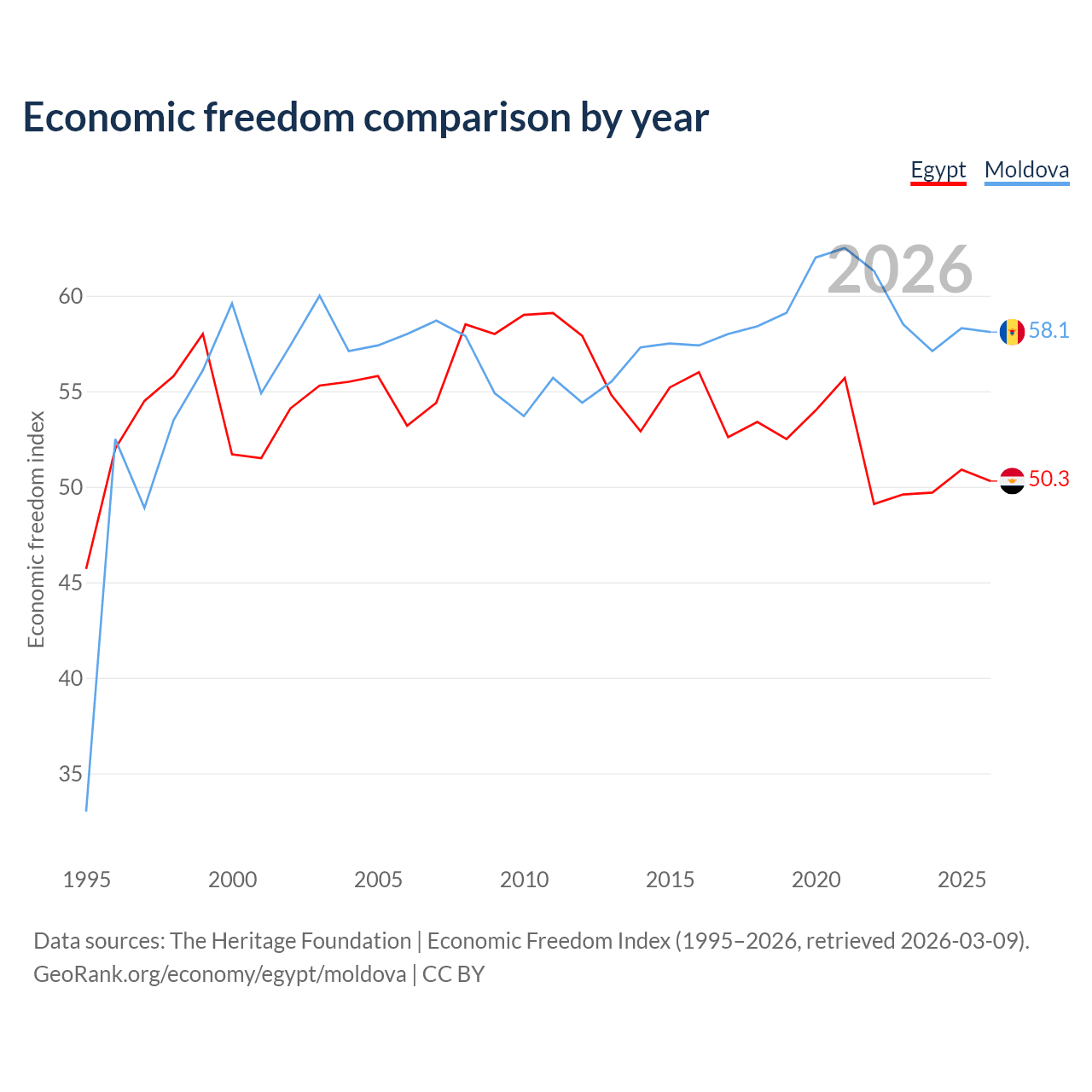 The Economic Freedom Index for Egypt is 50.3, ranking 160/197, compared to 58.1 for Moldova, ranking 112/197. The chart above displays a comparison of annual changes in economic freedom indexes.