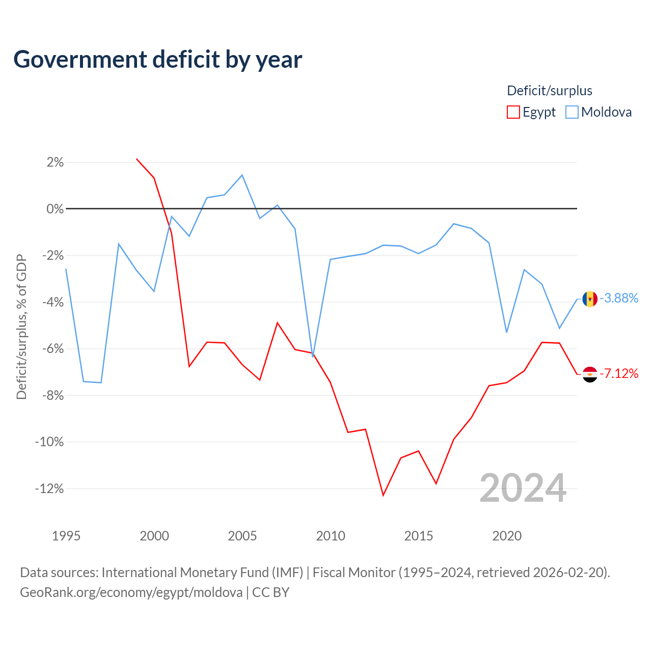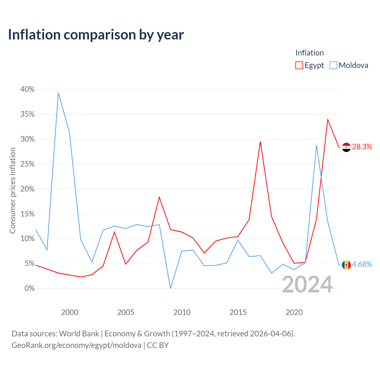 Egypt has a GDP of $389B compared to $18.2B for Moldova, ranking 41/197 and 134/197 by economy size, respectively.