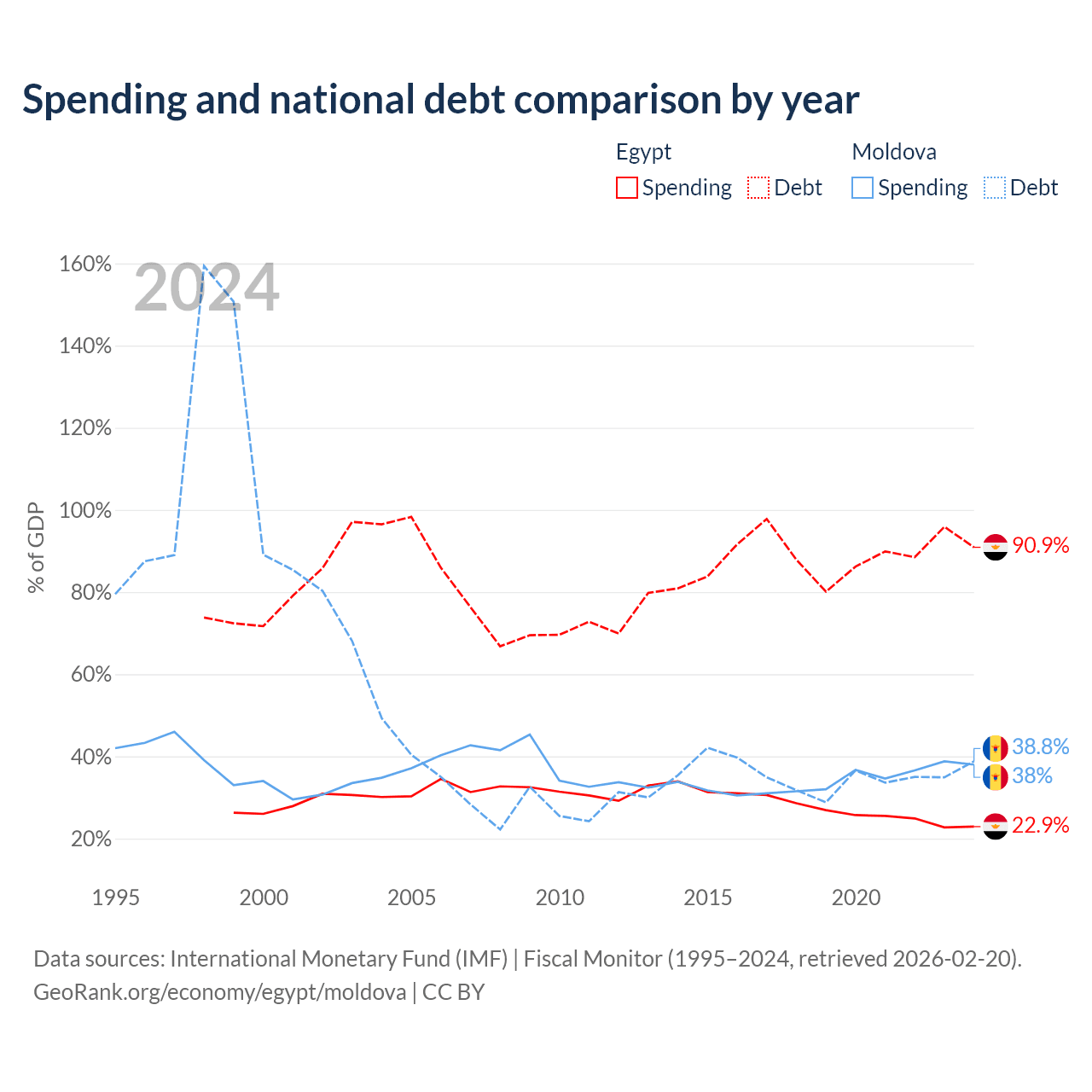 Egypt has $354B in government debt (90.9% of GDP), compared to $7.06B (38.8% of GDP) in Moldova.