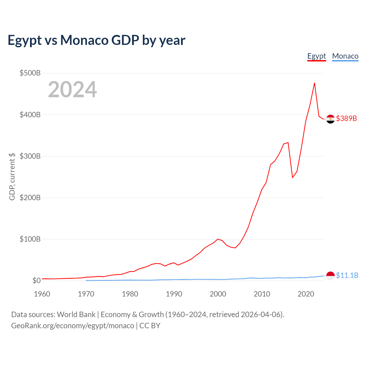 Egypt has a GDP of $389B compared to $11.1B for Monaco, ranking 41/197 and 152/197 by economy size, respectively.