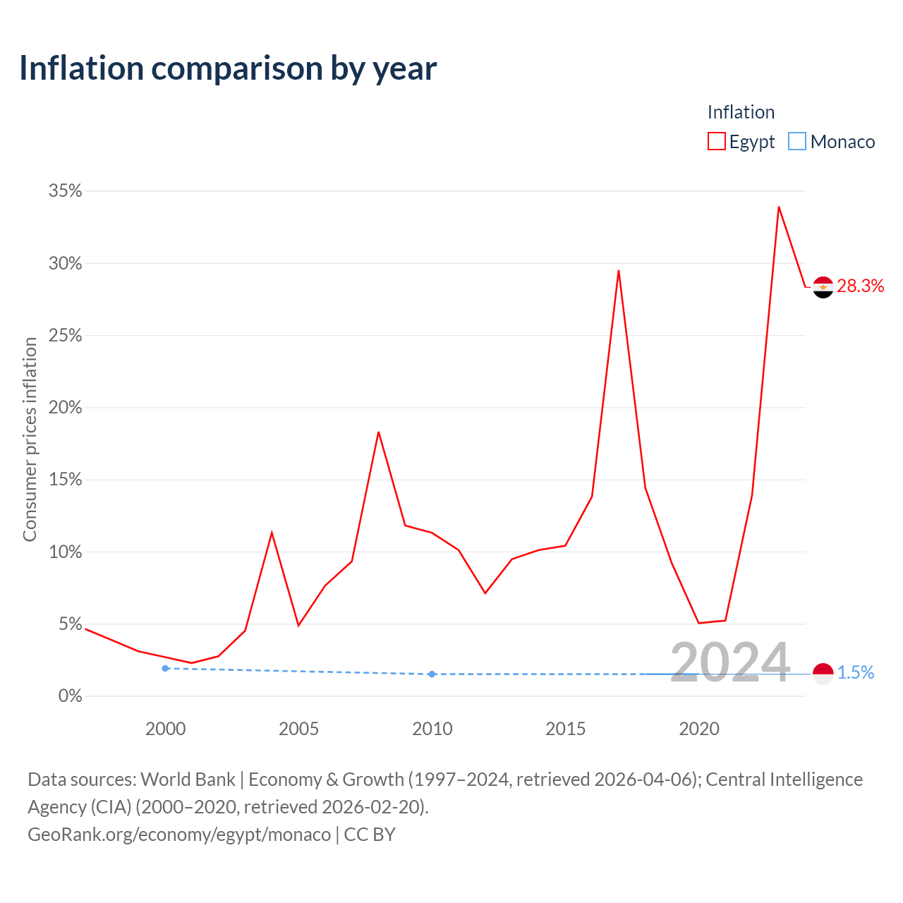 Over the past 21 years, Egypt has recorded an average annual inflation rate of 9.79%, compared with 1.58% in Monaco. In 2020, inflation was 28.3% in Egypt and 1.5% in Monaco.