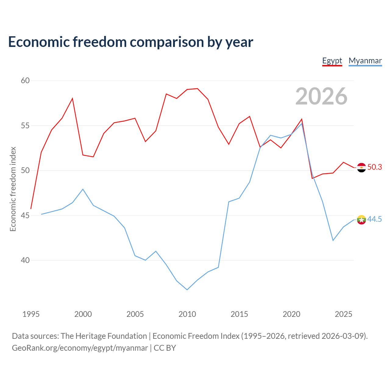 The Economic Freedom Index for Egypt is 50.3, ranking 160/197, compared to 44.5 for Myanmar, ranking 180/197. The chart above displays a comparison of annual changes in economic freedom indexes.