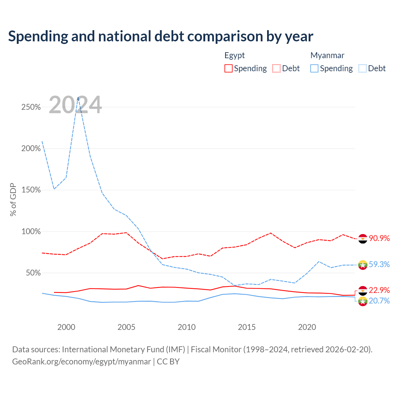 Egypt has $354B in government debt (90.9% of GDP), compared to $44B (59.3% of GDP) in Myanmar.