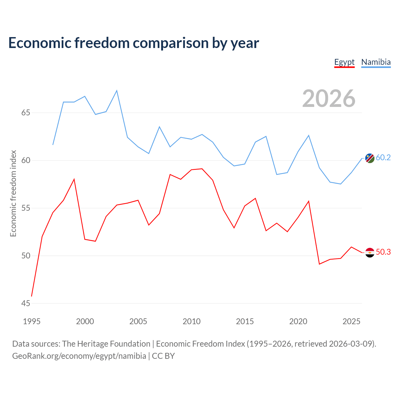 The Economic Freedom Index for Egypt is 50.3, ranking 160/197, compared to 60.2 for Namibia, ranking 95/197. The chart above displays a comparison of annual changes in economic freedom indexes.