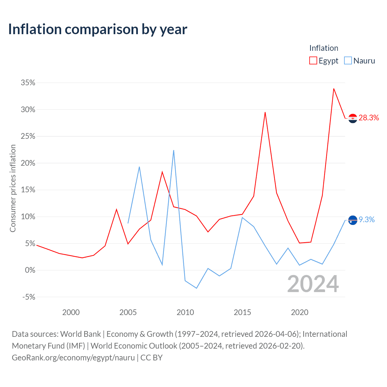Over the past 20 years, Egypt has recorded an average annual inflation rate of 13.2%, compared with 4.84% in Nauru. In 2024, inflation was 28.3% in Egypt and 9.3% in Nauru.