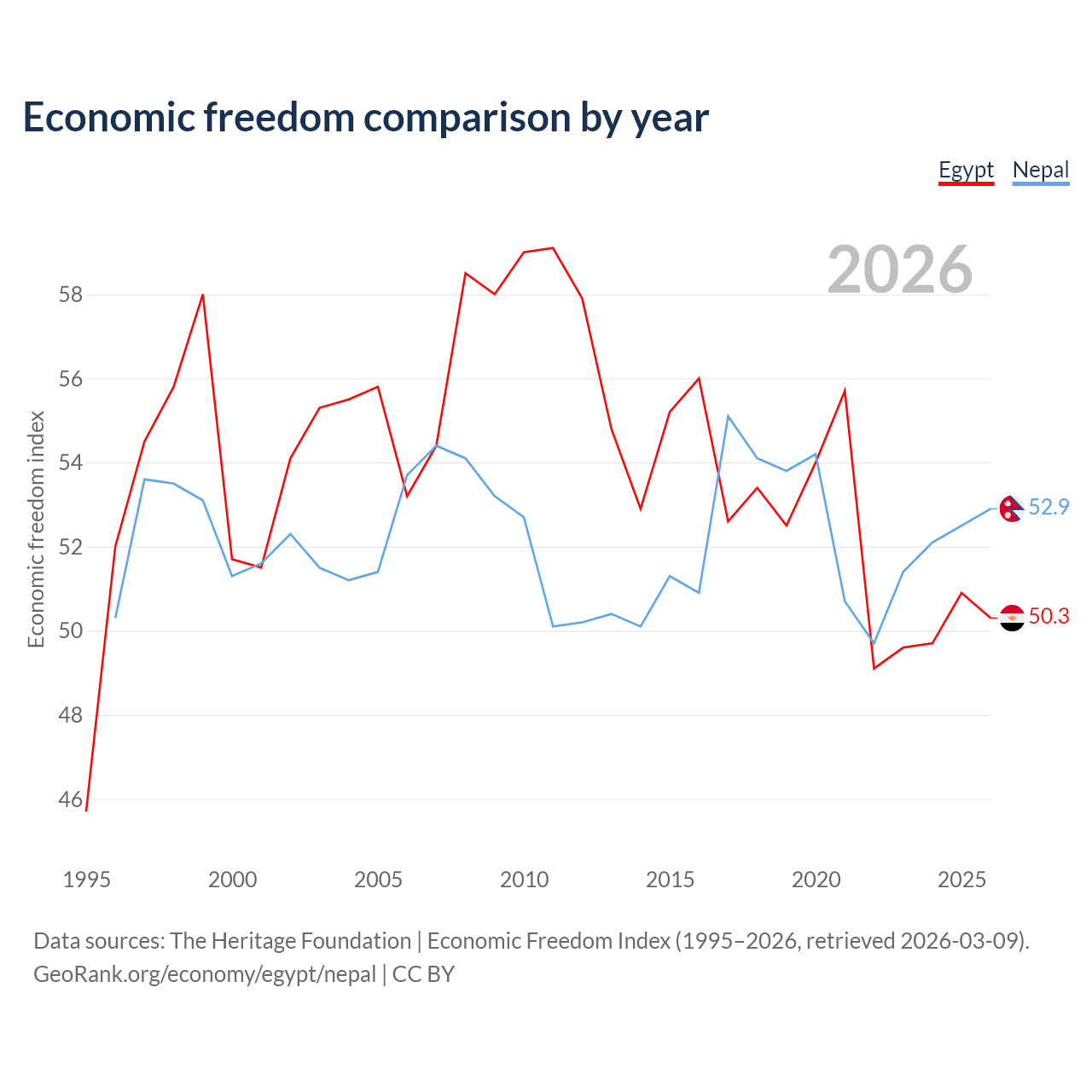 The Economic Freedom Index for Egypt is 50.3, ranking 160/197, compared to 52.9 for Nepal, ranking 144/197. The chart above displays a comparison of annual changes in economic freedom indexes.