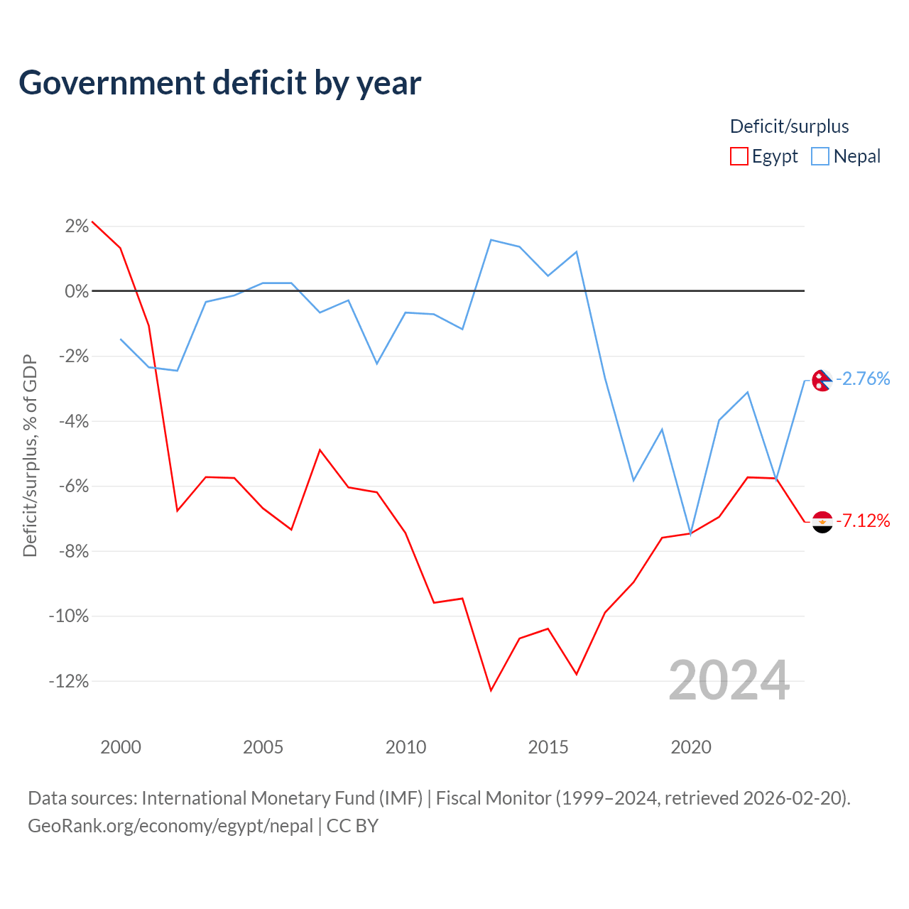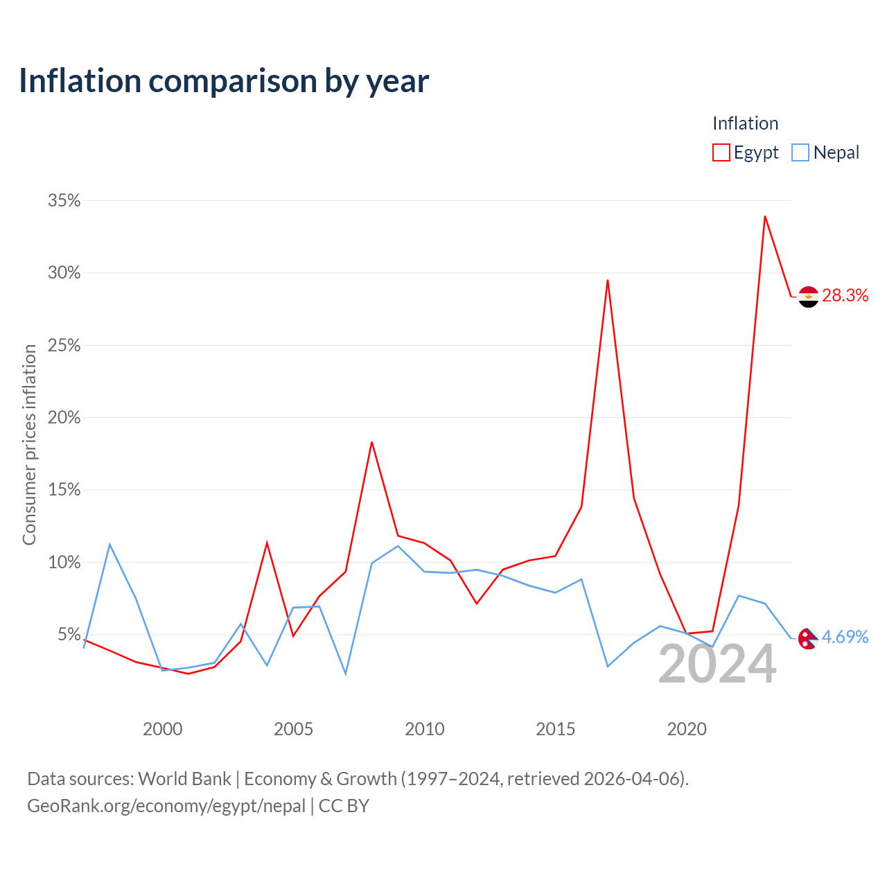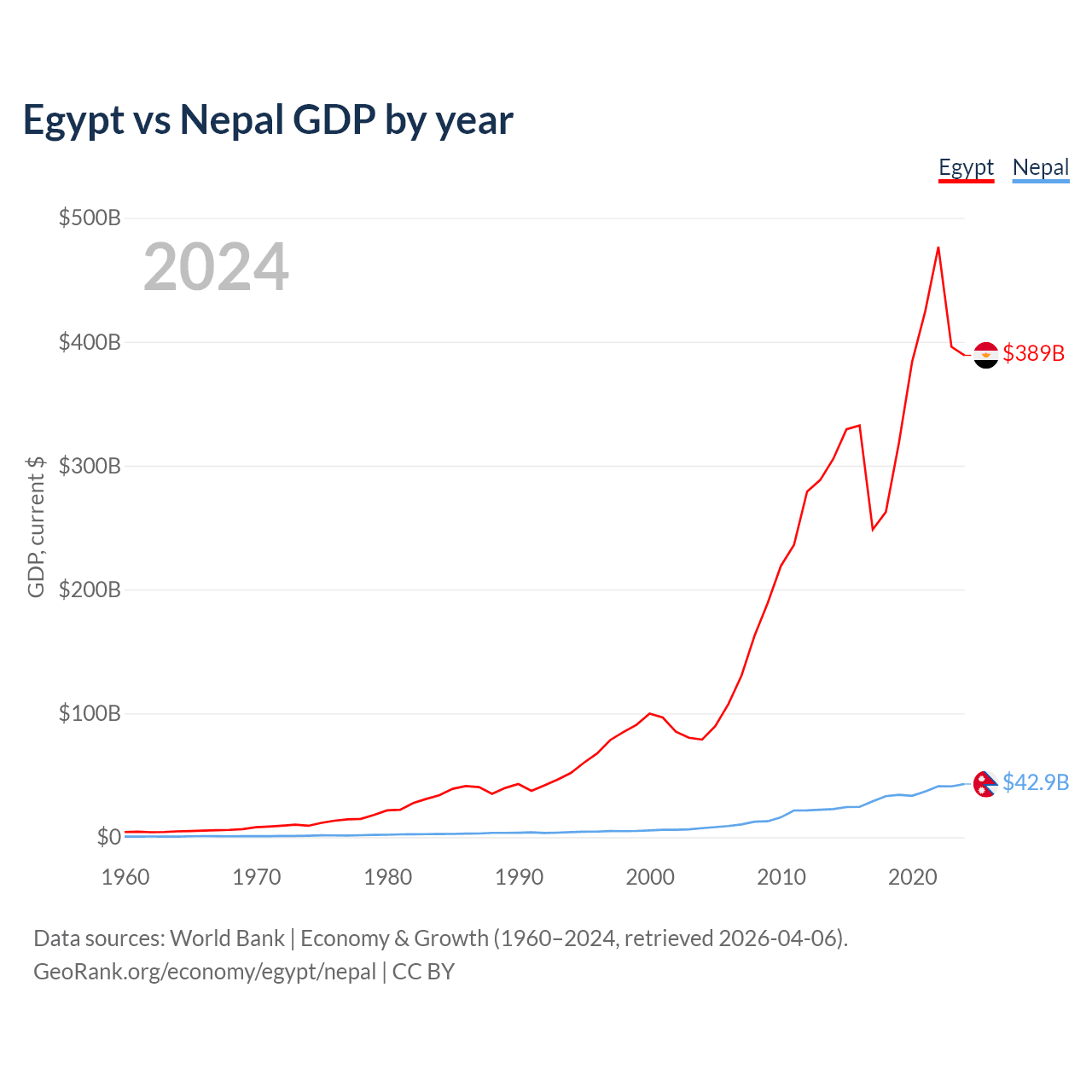 Egypt has a GDP of $389B compared to $42.9B for Nepal, ranking 41/197 and 101/197 by economy size, respectively.