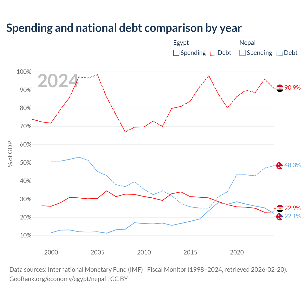 Egypt has $354B in government debt (90.9% of GDP), compared to $20.7B (48.3% of GDP) in Nepal.