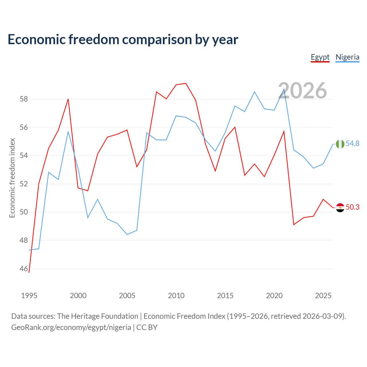 The Economic Freedom Index for Egypt is 50.3, ranking 160/197, compared to 54.8 for Nigeria, ranking 132/197. The chart above displays a comparison of annual changes in economic freedom indexes.
