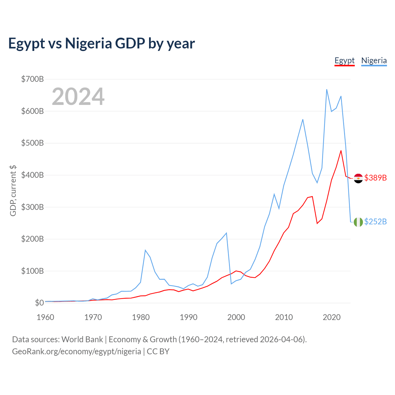 Egypt has a GDP of $389B compared to $252B for Nigeria, ranking 41/197 and 54/197 by economy size, respectively.
