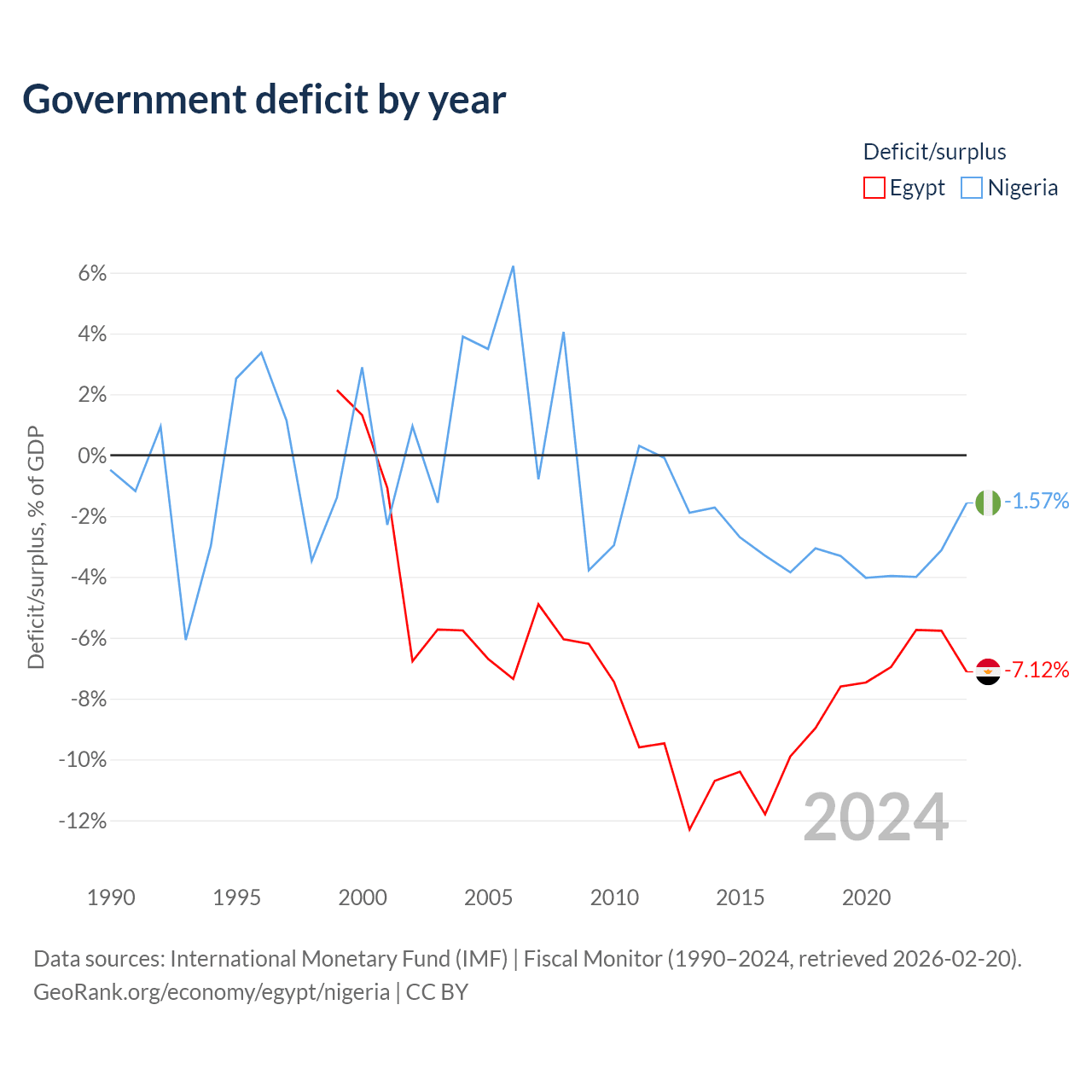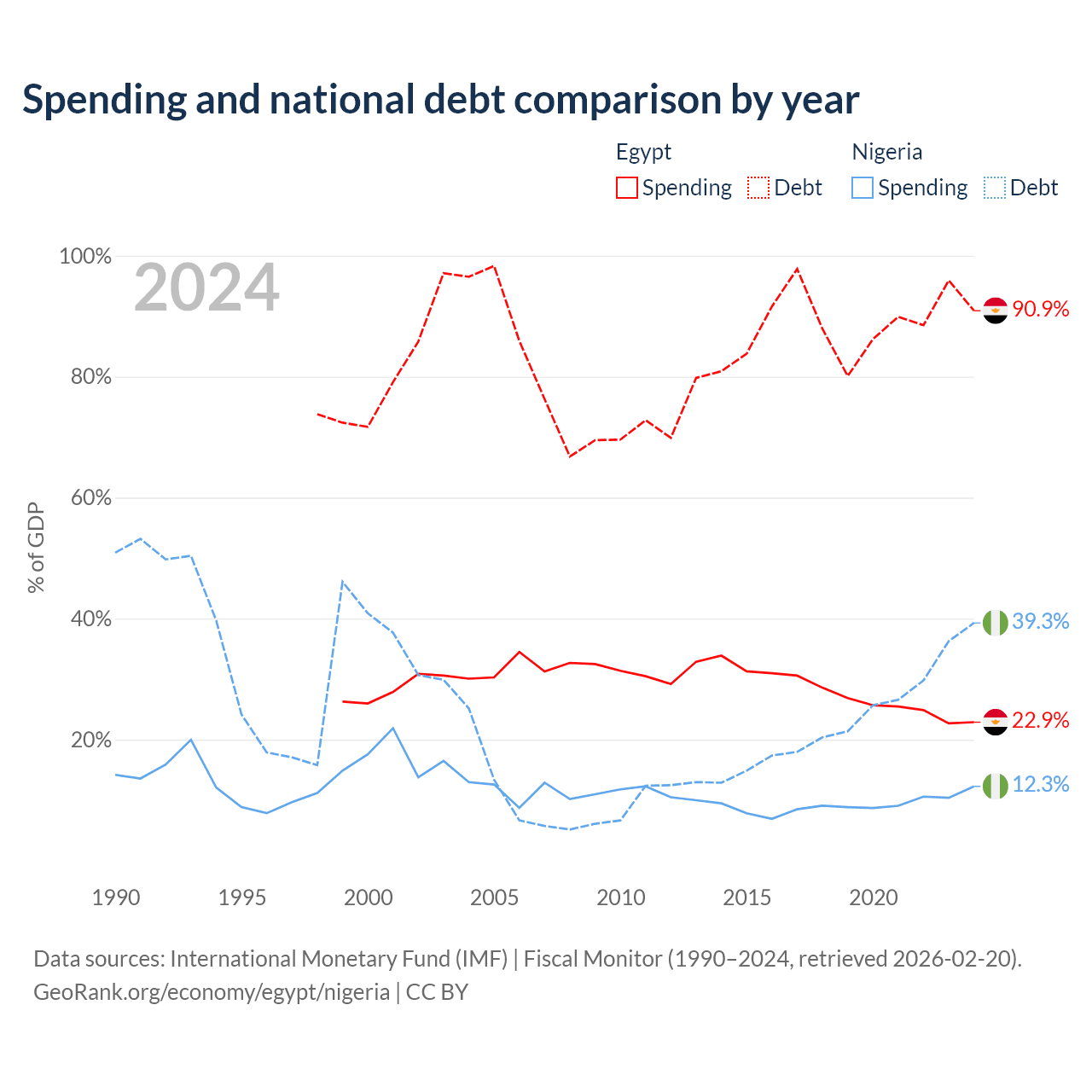 Egypt has $354B in government debt (90.9% of GDP), compared to $99.2B (39.3% of GDP) in Nigeria.