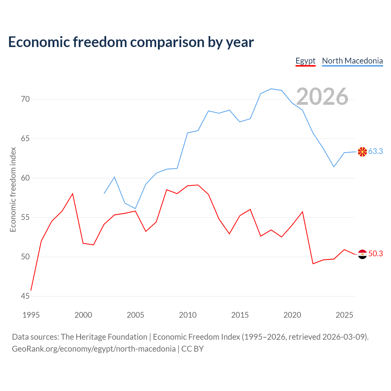 The Economic Freedom Index for Egypt is 50.3, ranking 160/197, compared to 63.3 for North Macedonia, ranking 81/197. The chart above displays a comparison of annual changes in economic freedom indexes.