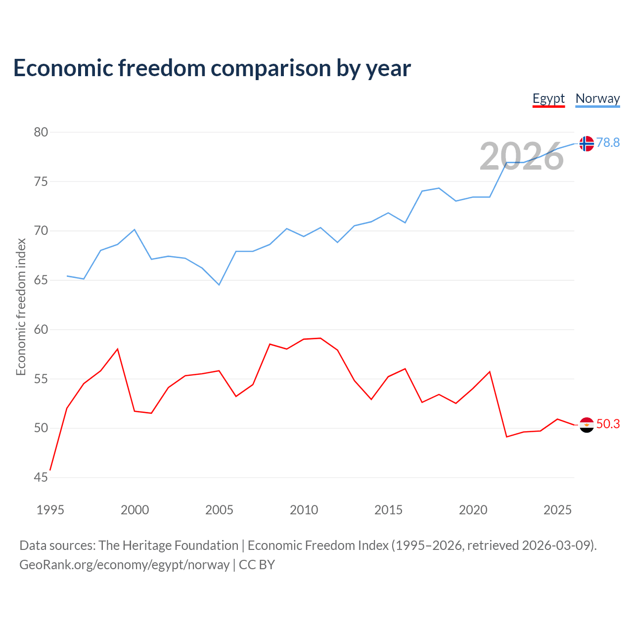 The Economic Freedom Index for Egypt is 50.3, ranking 160/197, compared to 78.8 for Norway, ranking 9/197. The chart above displays a comparison of annual changes in economic freedom indexes.